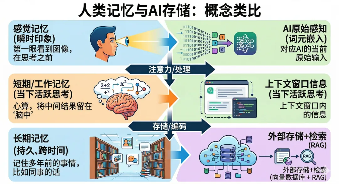 感觉记忆和短期记忆,模型天生就有——就是它的输入层和上下文窗口。真正要解决的,是长期记忆。