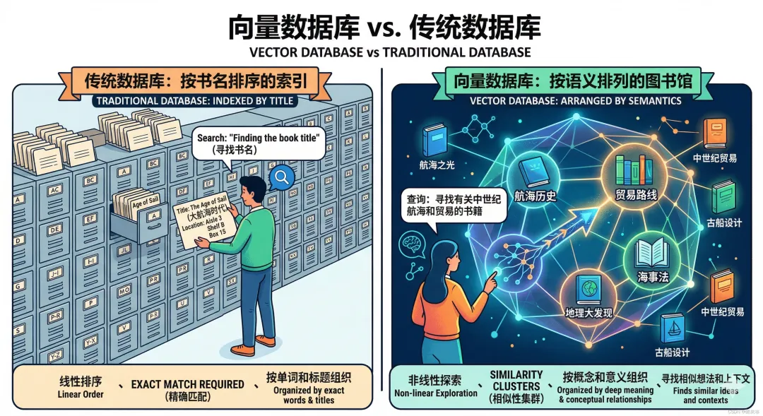传统数据库(比如MySQL)像图书馆的书名索引——你必须知道确切的书名,才能找到那本书。搜”经济学”找不到《国富论》,因为书名里没有”经济学”三个字。