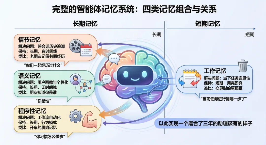 认知科学把人类记忆分成好几种,AI研究者照着这个框架建了智能体的记忆体系。四种类型,各管一摊。