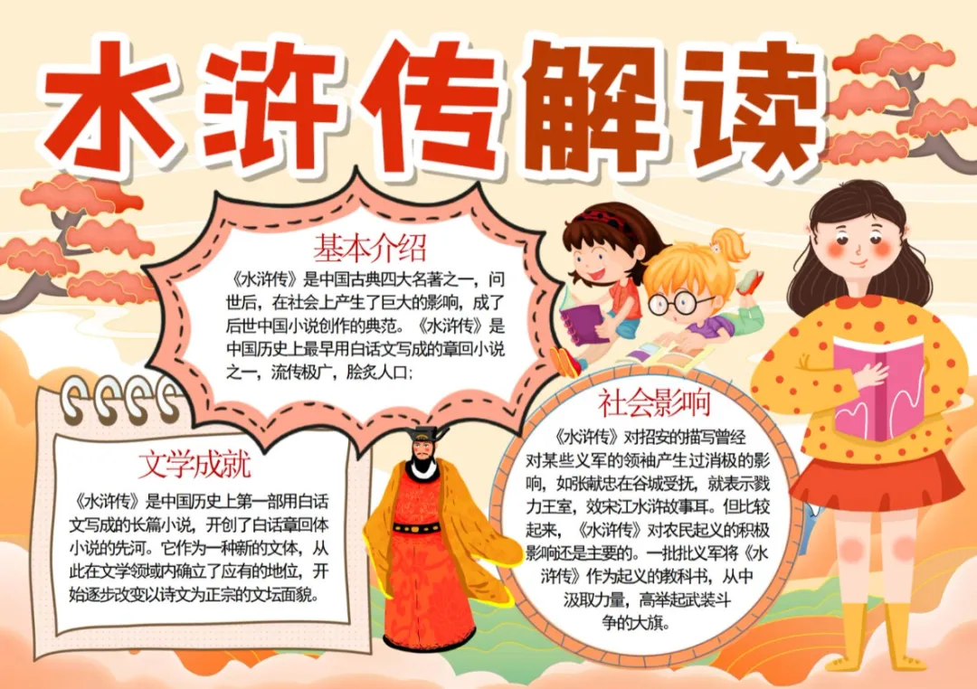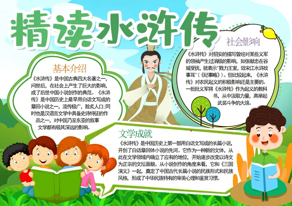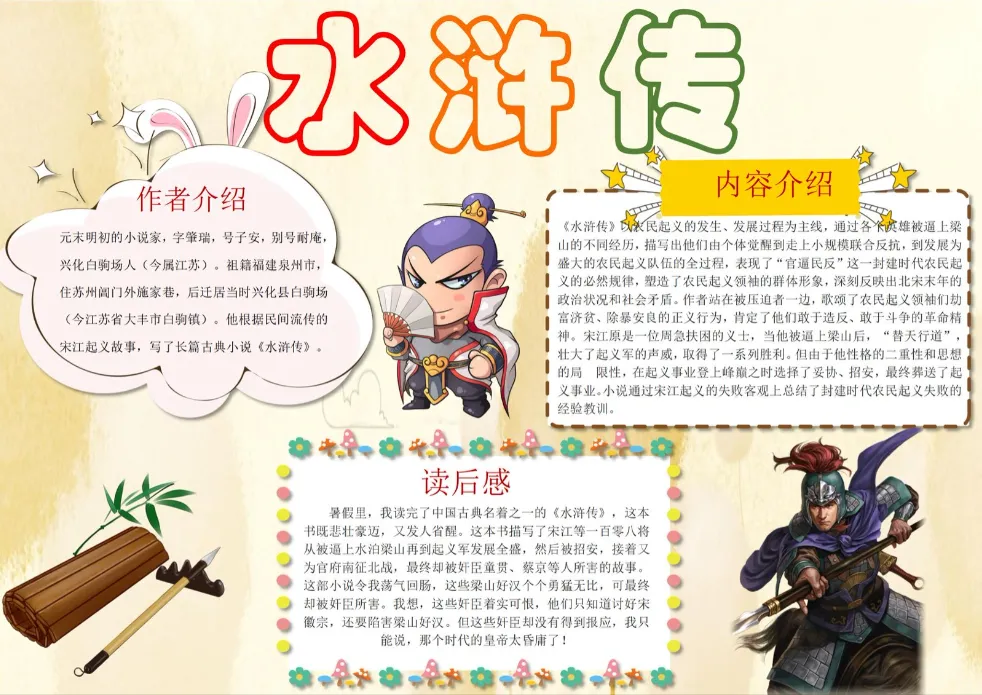 提起《水浒传》,108 将的忠义豪情、跌宕起伏的故事情节总能让人热血沸腾。把这份经典搬上手抄报,既能深化对名著的理解,又能展现创意才华。今天就分享超实用的手抄报制作指南,新手也能快速上手!
