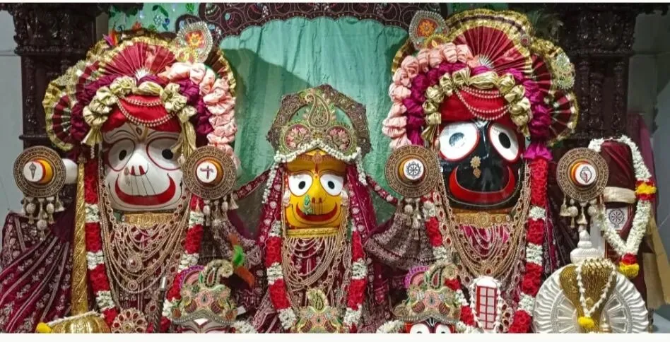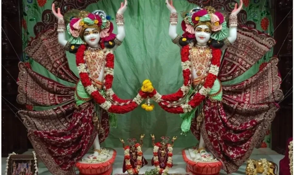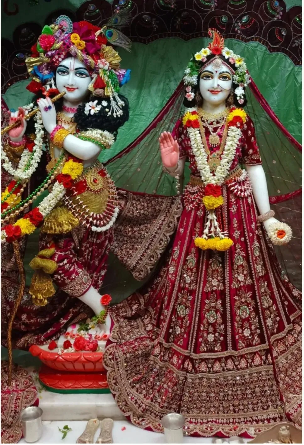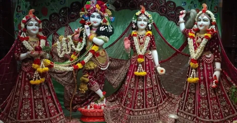 我得到了施瑞•施瑞•尼太•高冉嘎(Śrī Śrī Nitāi Gaurāṅga)、施瑞•施瑞•茹阿达•奎师那•拉丽塔•维莎卡 (Śrī Śrī Rādhā Kṛṣṇa Lalitā Viśākhā)、施瑞•施瑞•茹克蜜妮•奎师那•萨缇亚芭玛(Śrī Śrī Rukmiṇī Kṛṣṇa Satyabhāmā)、施瑞•哥瓦尔丹•希拉(Śrī Govardhana-śilā)、施瑞•施瑞•佳甘纳特•巴拉戴瓦•苏巴卓•苏达尔善•查夸(Śrī Śrī Jagannātha Baladeva Subhadrā Sudarśana Cakra)、施瑞•施瑞•拉克施蜜•纳茹阿星哈(Śrī Śrī Lakṣmī Narasiṁha),以及施瑞拉•帕布帕德的达尔善。我供奉了鲜花和阿尔提。