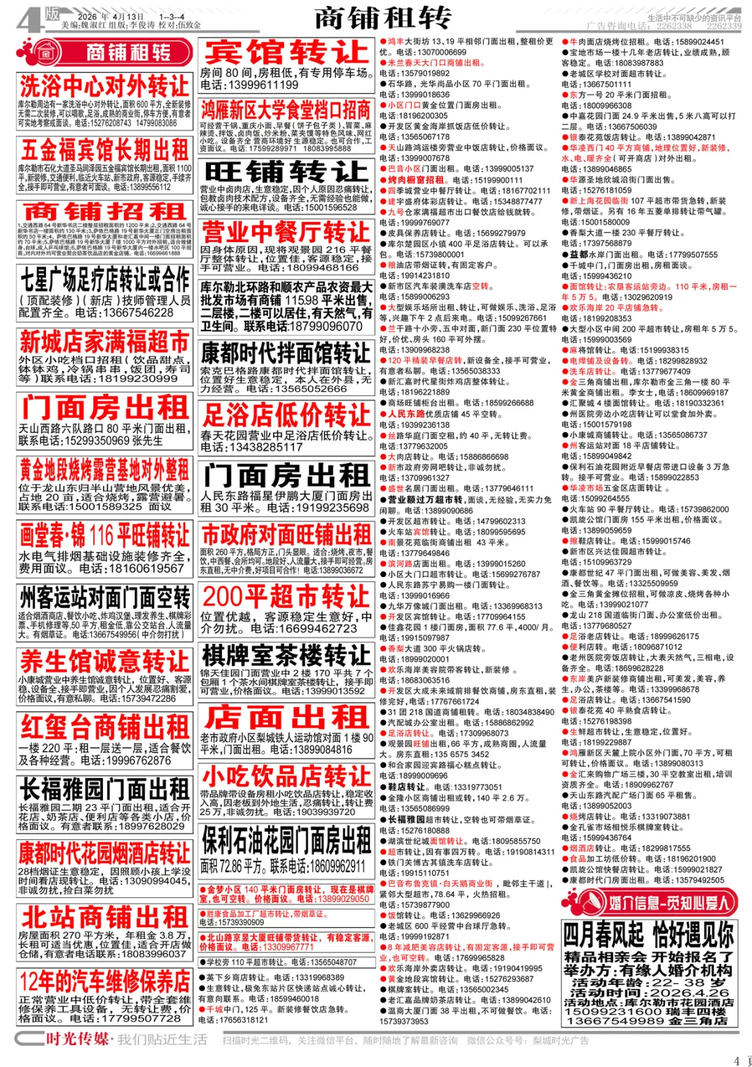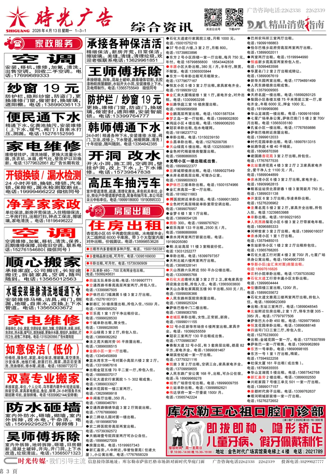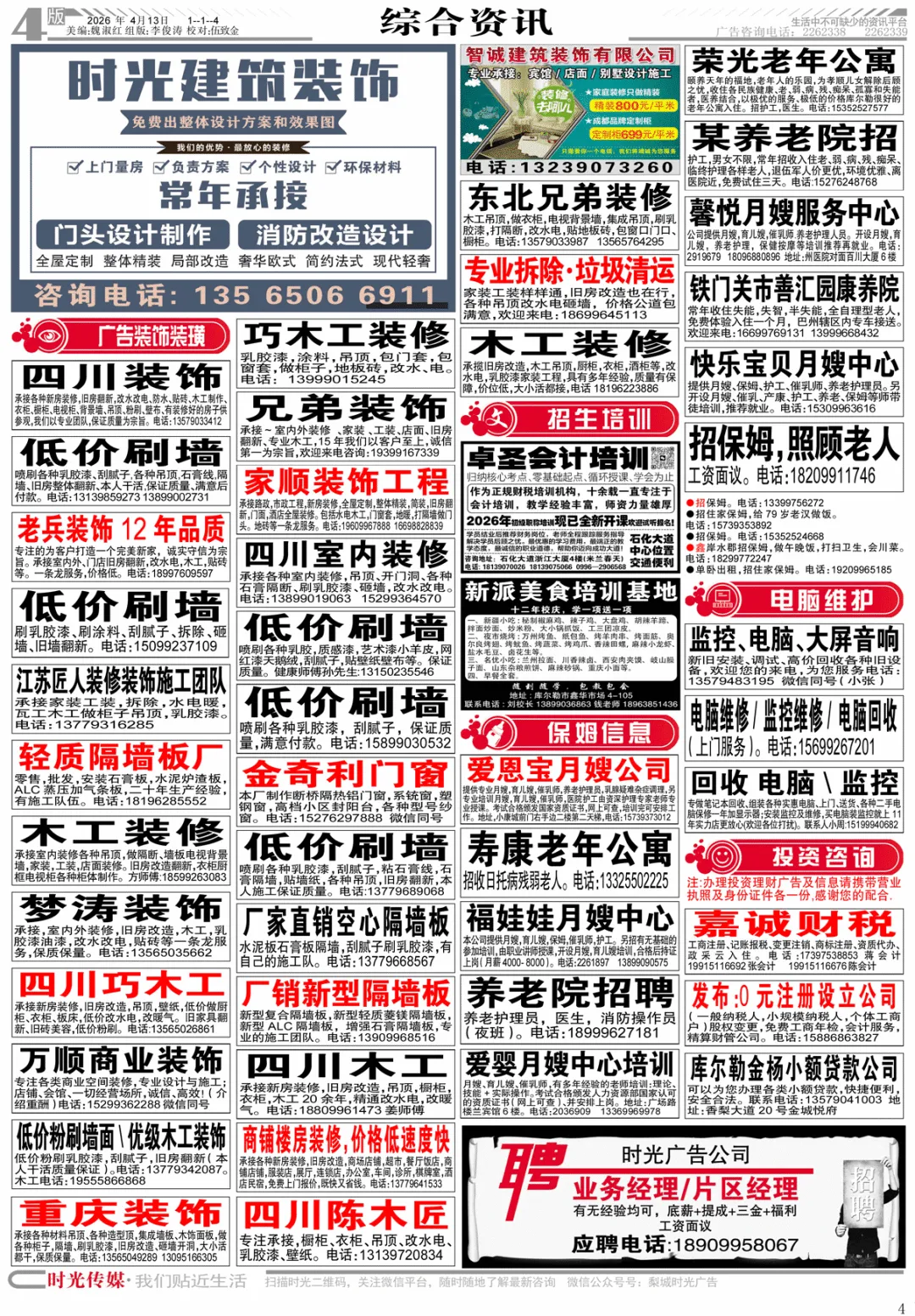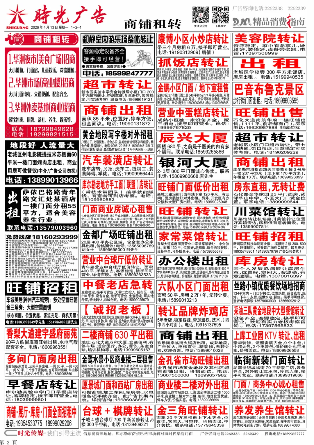 《电子看报》周一版梨城时光广告 2026年4月14日 招聘信息 商铺信息 家政·广告装饰信息 综合信息 时光广告推广 微 信 号:shiguang2916 广告刊登电话:18699641319 微信同号 戳“阅读原文”我们一起进步