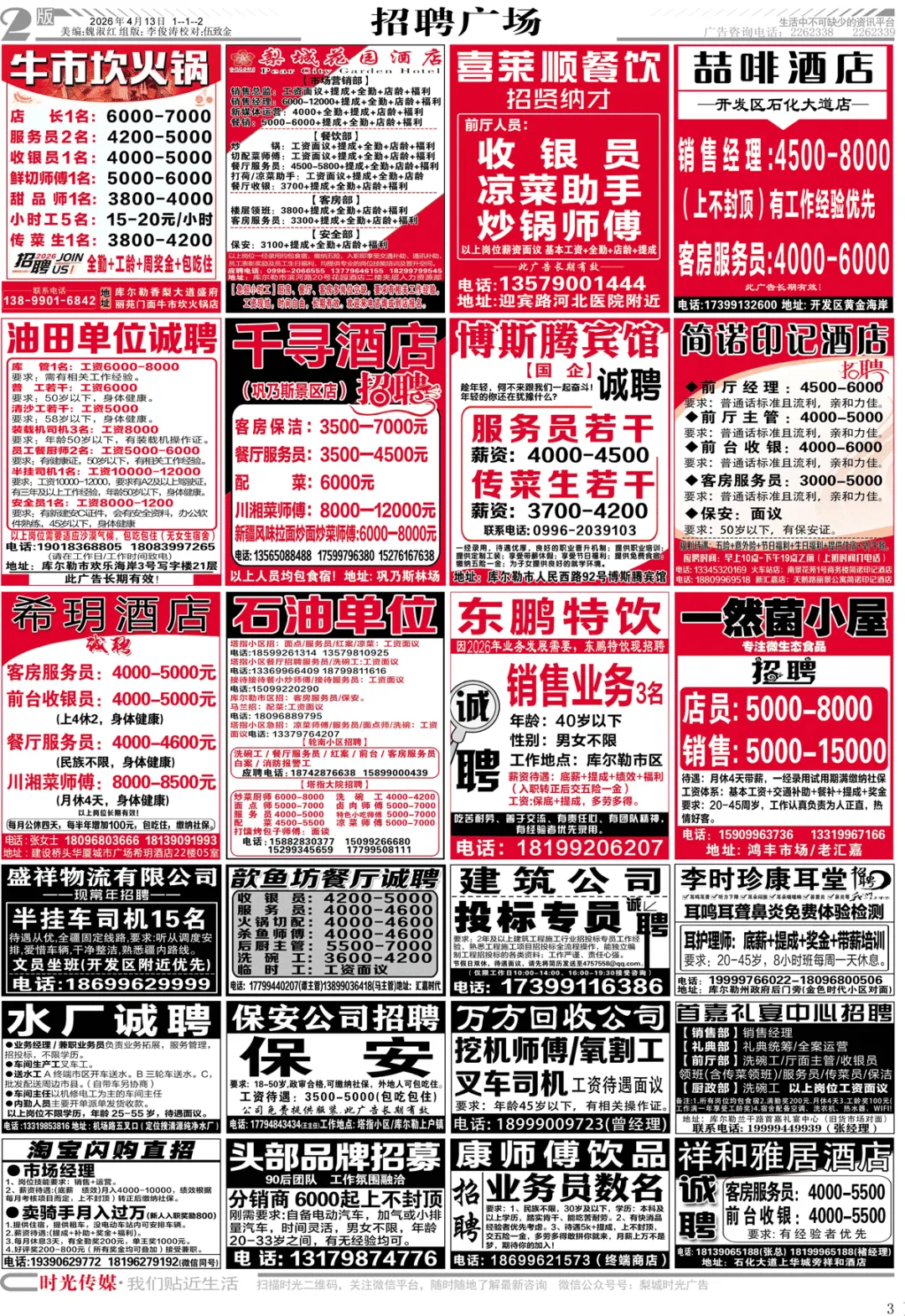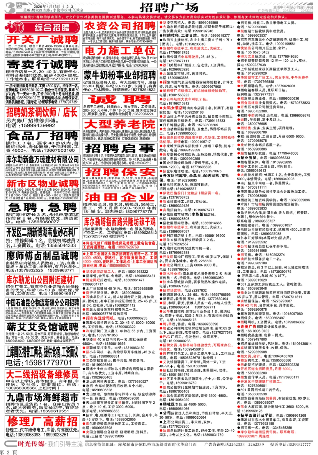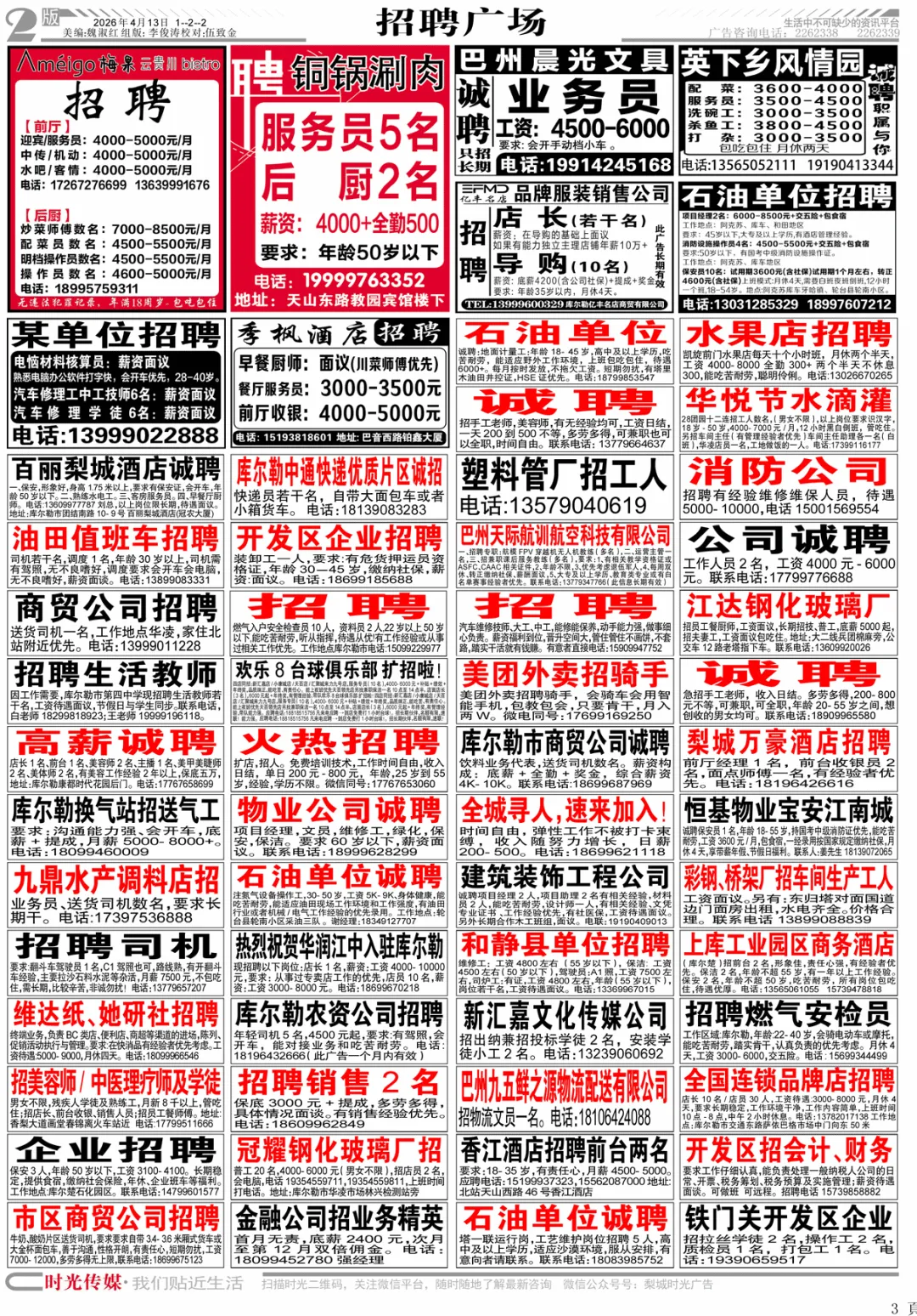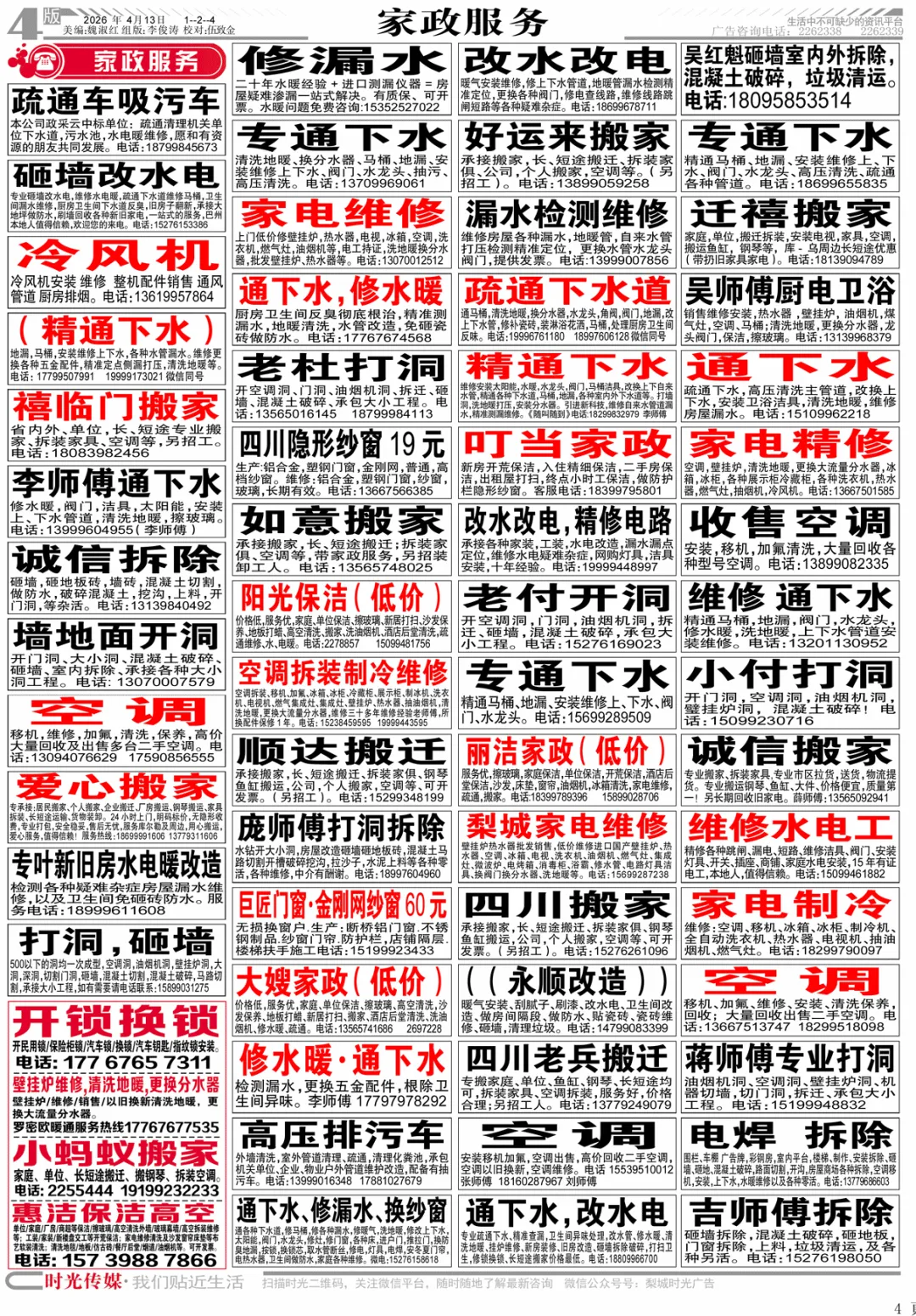 《电子看报》周一版梨城时光广告 2026年4月14日 招聘信息 商铺信息 家政·广告装饰信息 综合信息 时光广告推广 微 信 号:shiguang2916 广告刊登电话:18699641319 微信同号 戳“阅读原文”我们一起进步