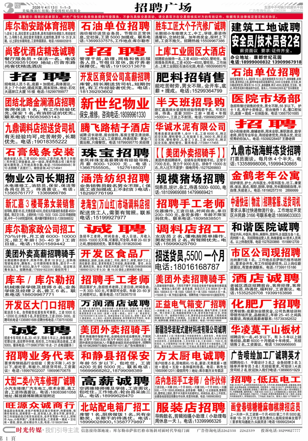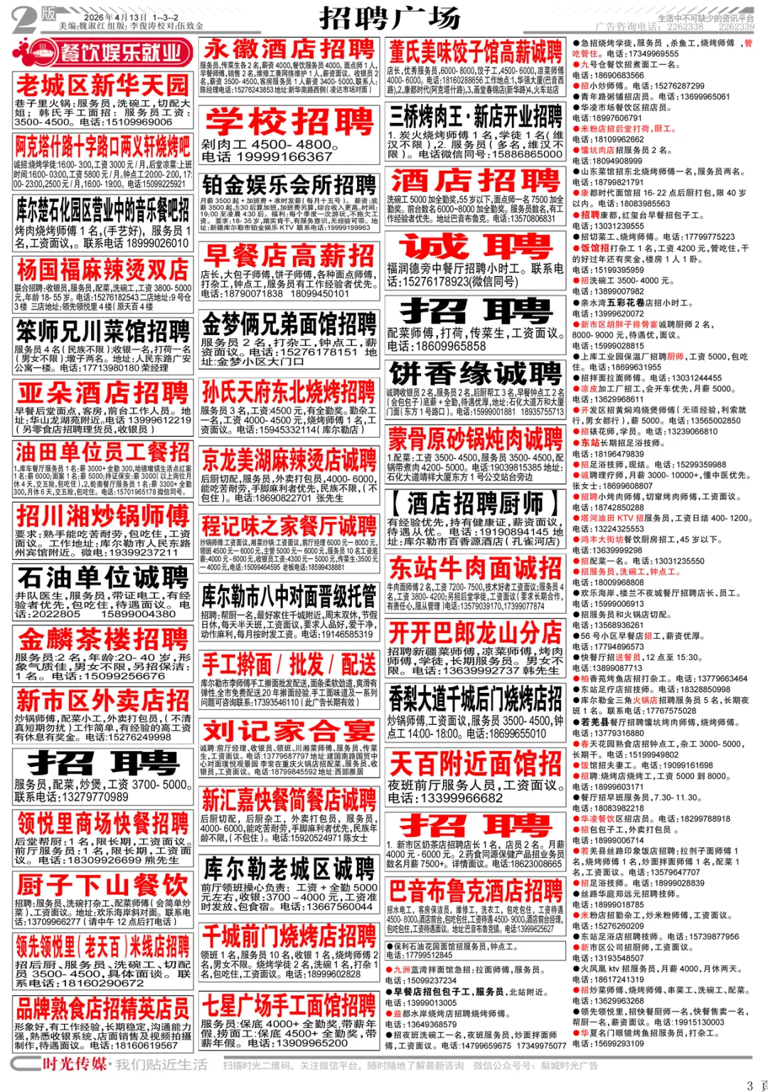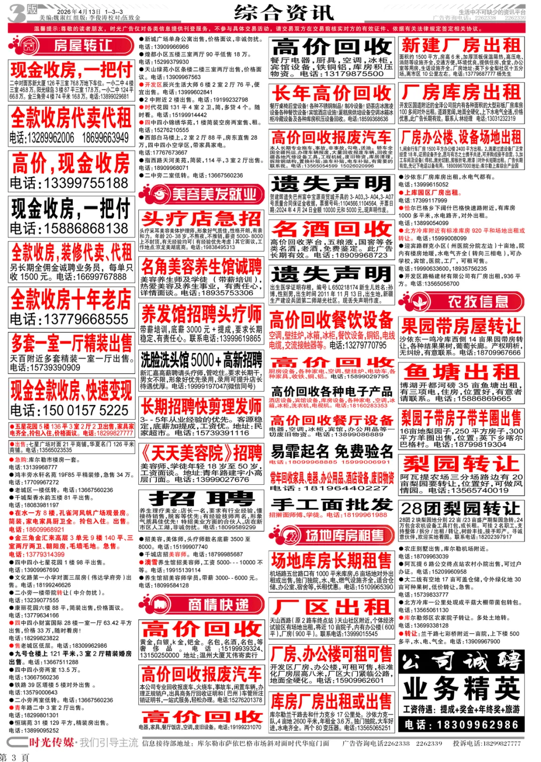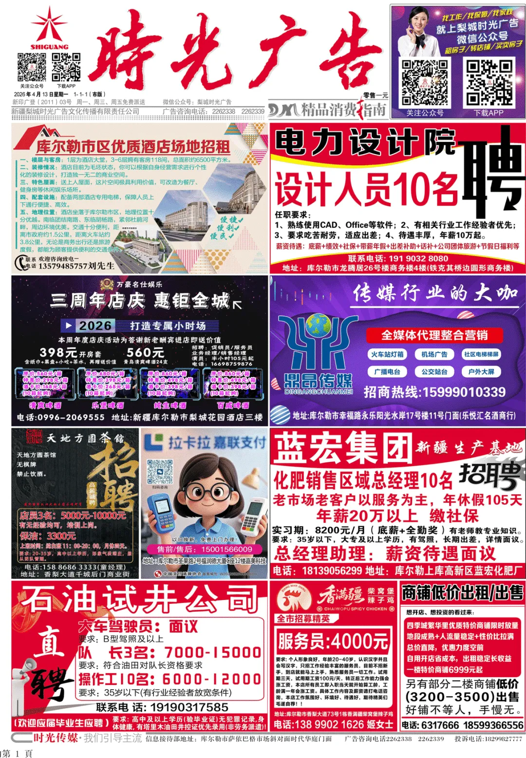 《电子看报》周一版梨城时光广告 2026年4月14日 招聘信息 商铺信息 家政·广告装饰信息 综合信息 时光广告推广 微 信 号:shiguang2916 广告刊登电话:18699641319 微信同号 戳“阅读原文”我们一起进步