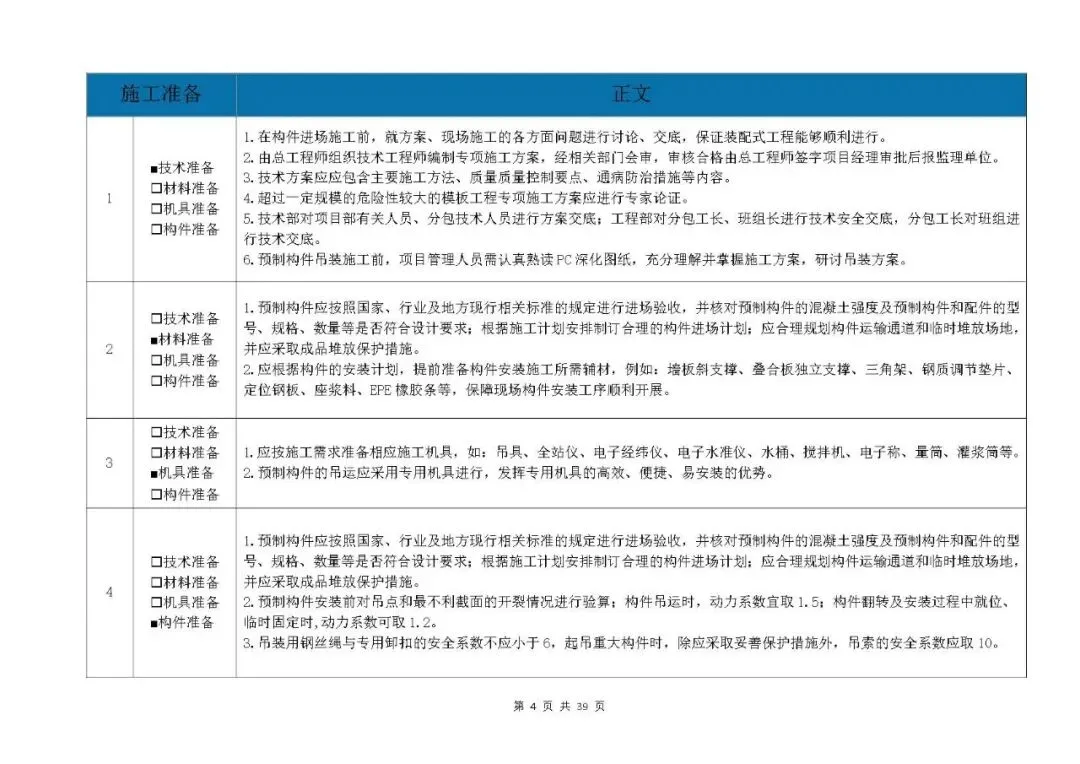 :从技术、材料、机具、构件四个方面明确准备工作要求,如编制专项方案、准备斜支撑等辅材、验算吊点等。 - 三、工艺流程