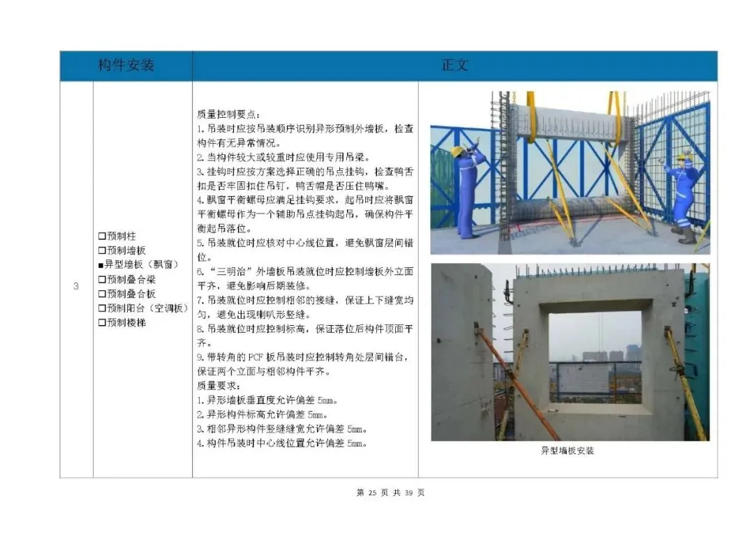这份由中建编制的《质量标准化管理手册(装配式工程分册)》,是指导装配式混凝土结构工程施工质量管理的核心文件。手册旨在推进项目施工质量管理标准化,加强对施工过程的管理和质量控制。其内容系统全面,共由标准引用、施工准备、工艺流程、构件运输、构件进场验收、构件现场堆放、转换层定位钢板、构件安装、构件节点连接九个部分构成。手册以现行国家及行业相关规范、图集和技术规程为依据,对装配式结构工程施工质量管理过程中的施工准备、工艺流程管理、质量控制标准等进行了详细规定和说明。例如,在“构件安装”部分,针对预制墙板、异型墙板(飘窗)、预制楼梯等不同构件,分别列出了吊装、就位、调整、固定的质量控制要点和允许偏差(如垂直度、标高、缝宽允许偏差均为5mm)。其核心价值在于为现场施工管理提供了执行施工工艺流程常态化、工序质量控制规范化的强有力指导,适用于含装配式结构工程项目,确保施工质量与验收合规。