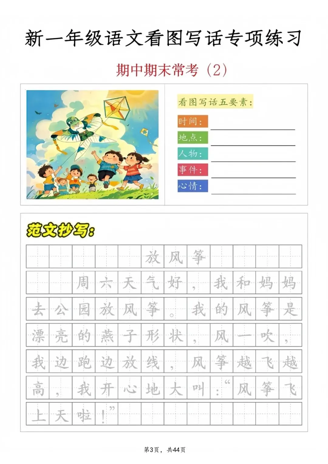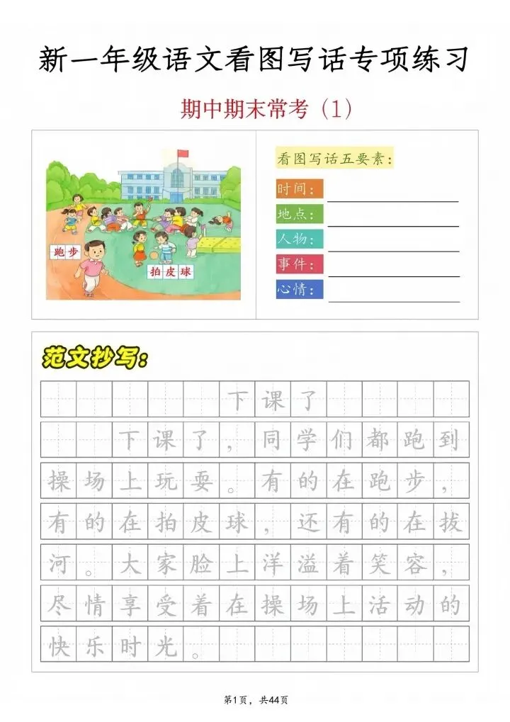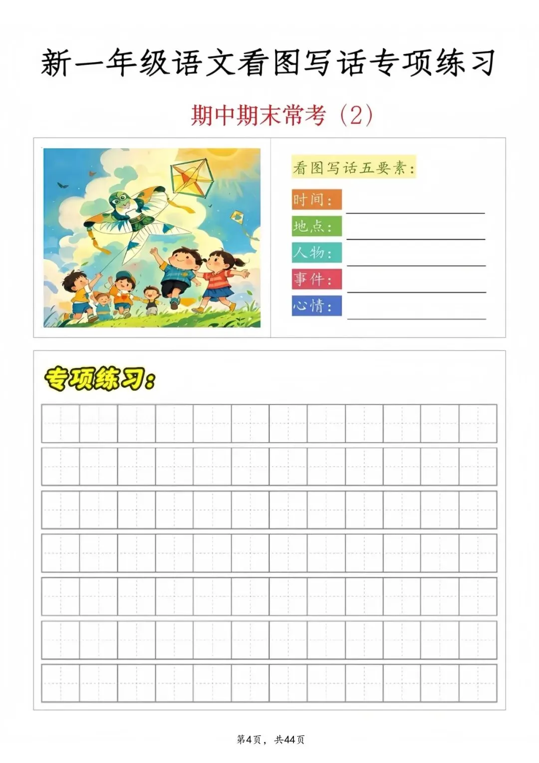 📚🔥26年新版一年级下册语文期中常考看图写话(完整版共44页)电子版可打印。看图写话是小学语文的重中之重,更是期中、期末考试的必考题,很多孩子刚接触时总不知道怎么下笔,要么写得太简单,要么抓不住重点。