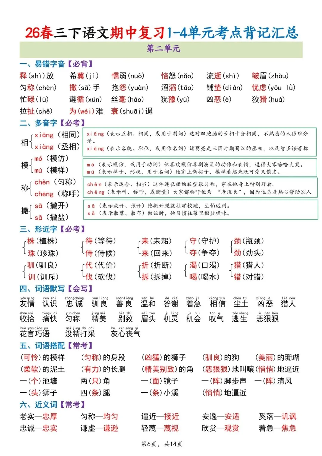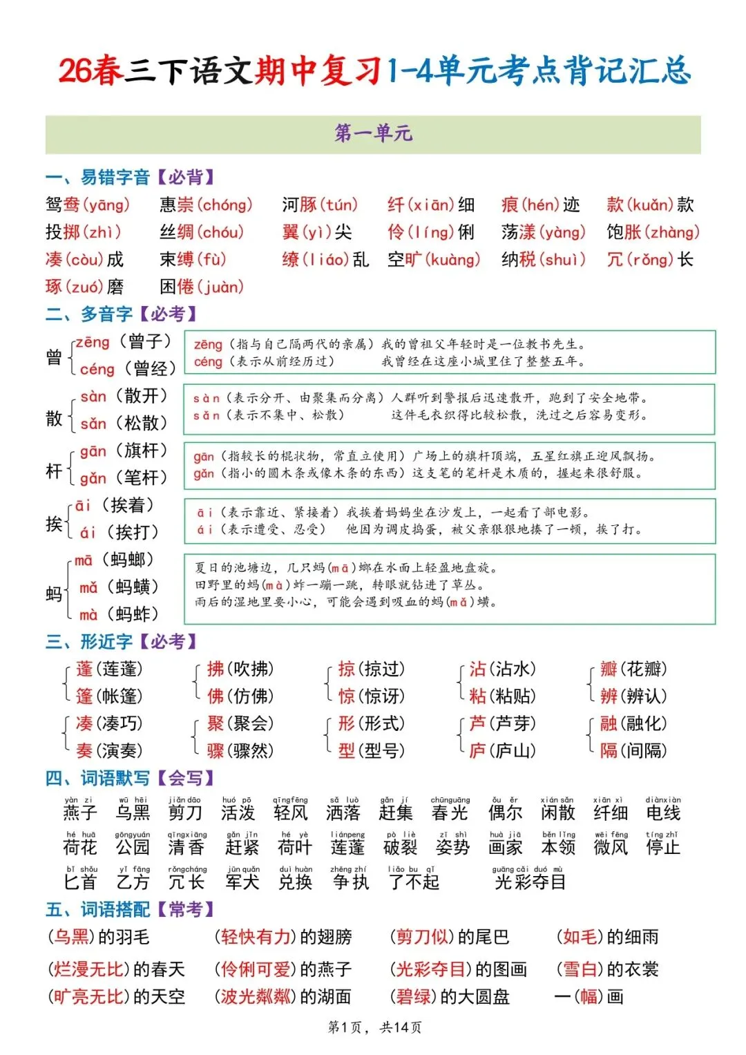 📚🔥26年新版三年级下册语文期中复习1-4单元必考点电子版可打印。马上迎来期中检测,三年级下册语文的基础考点细碎又关键,字音、字形、词语搭配稍有疏忽就容易丢分!今天给大家整理了26春三下语文期中复习1-4单元考点背记汇总,按“必背+必考+常考”分类梳理,帮孩子高效复习,稳稳拿下基础分!
