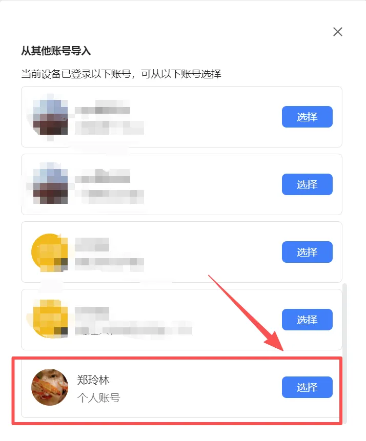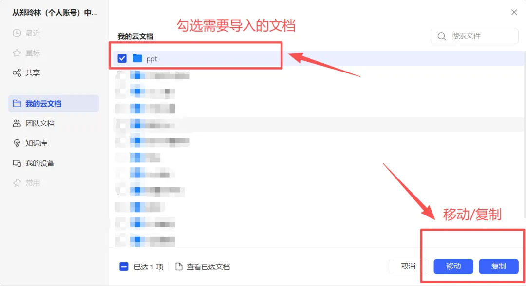 第二步,选择从其他账号导入-选择对应账号-勾选需导入的文件夹或文件-点击移动或复制,即可完成导入。