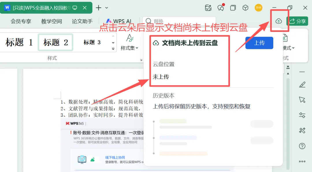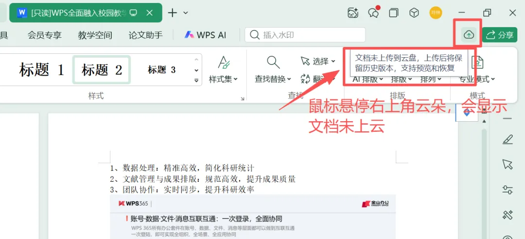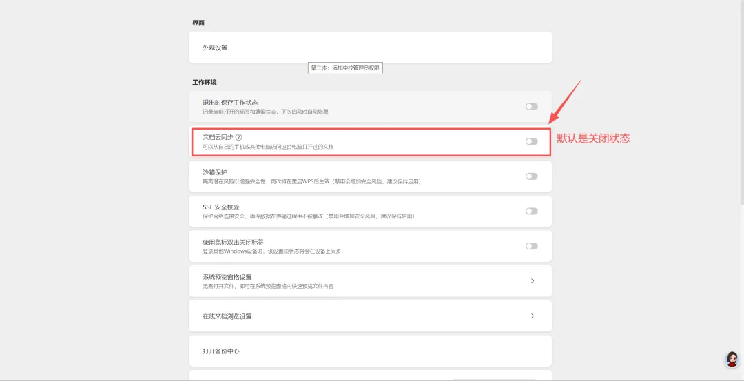 登录学校账号后,点击右上角设置查看文档云自动同步功能是否是关闭状态,默认是关闭状态。如果是打开状态可以点击关闭按钮,关闭文档云自动同步功能。