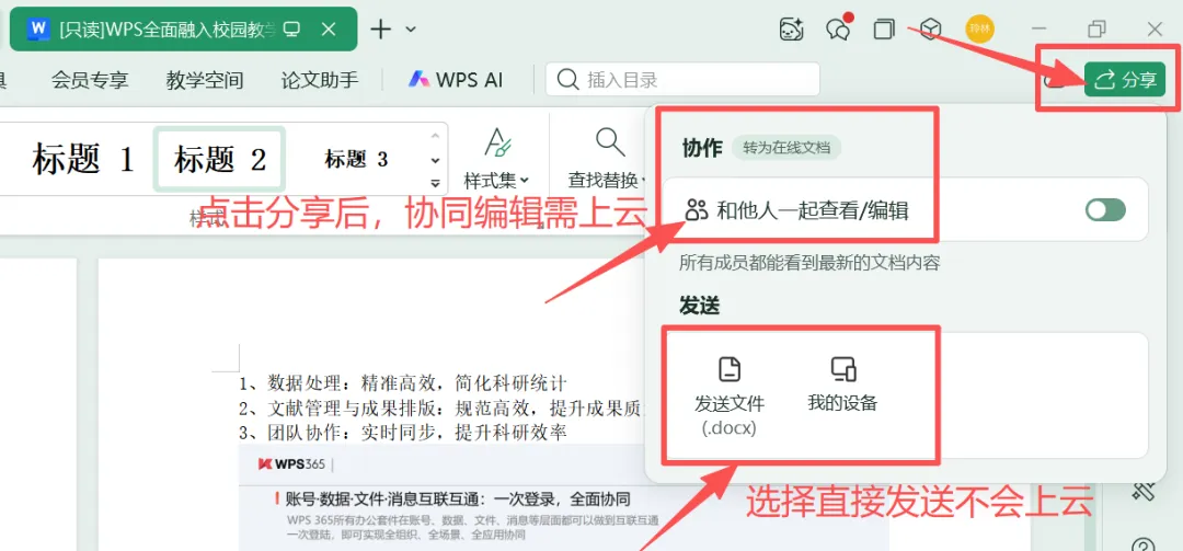 如果文件确实需要协同编辑,可以点击分享按钮中的协作选项将文件上传到云端。如选择直接以文件形式发送,则不会将文件上传到云端,可放心点击。