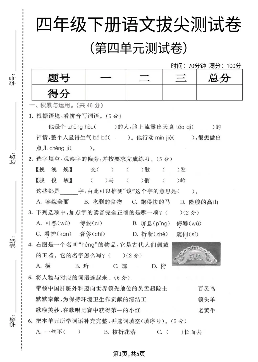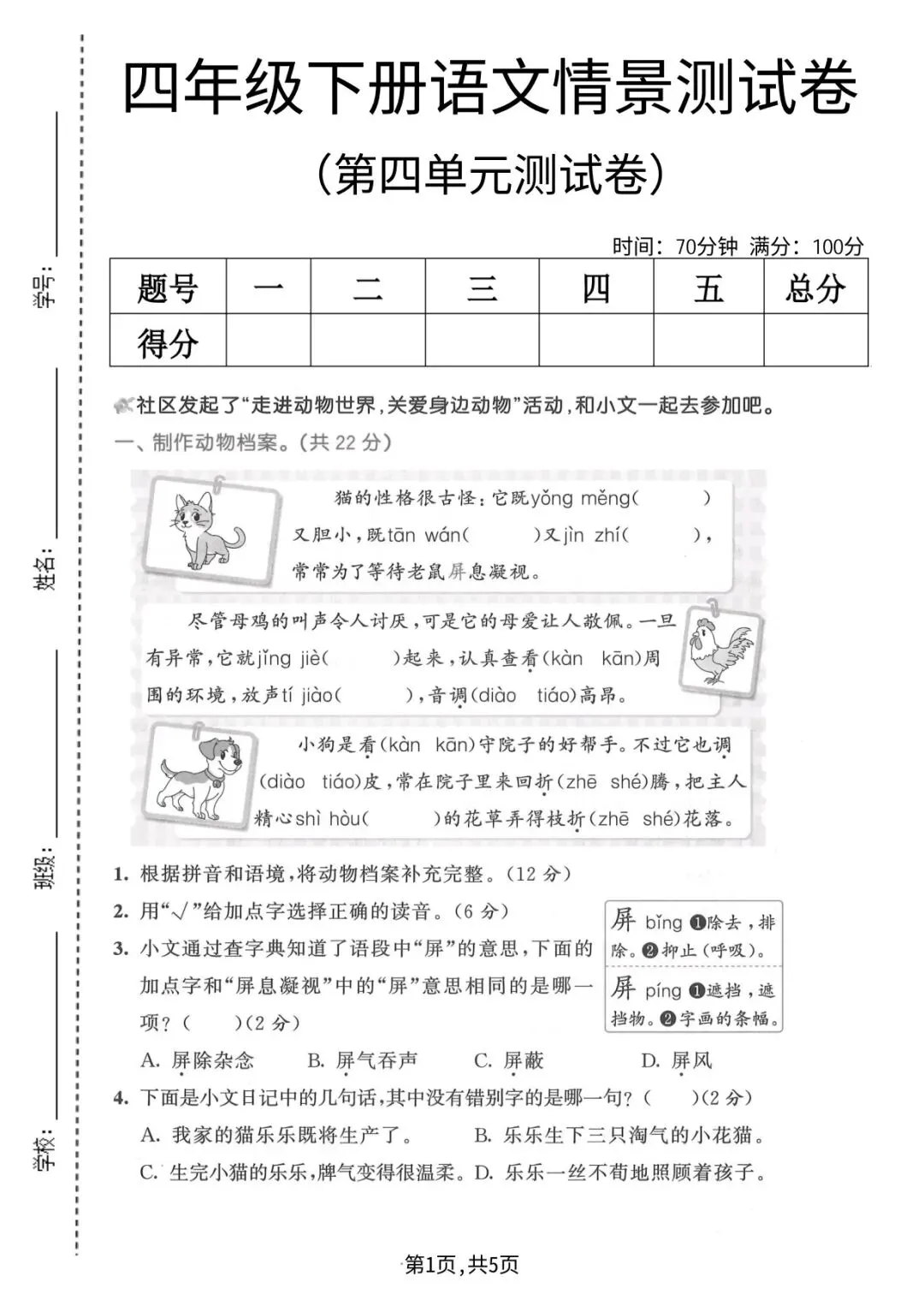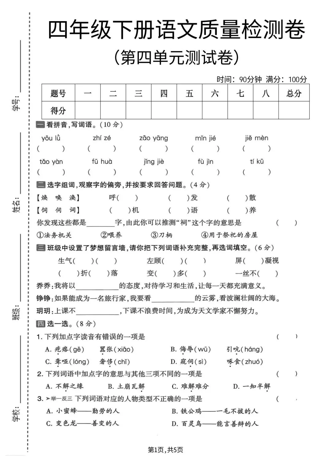 2026年春四年级下册语文人教部编版《第四单元·检测试卷》(共3套,含答案)| 完整可打印