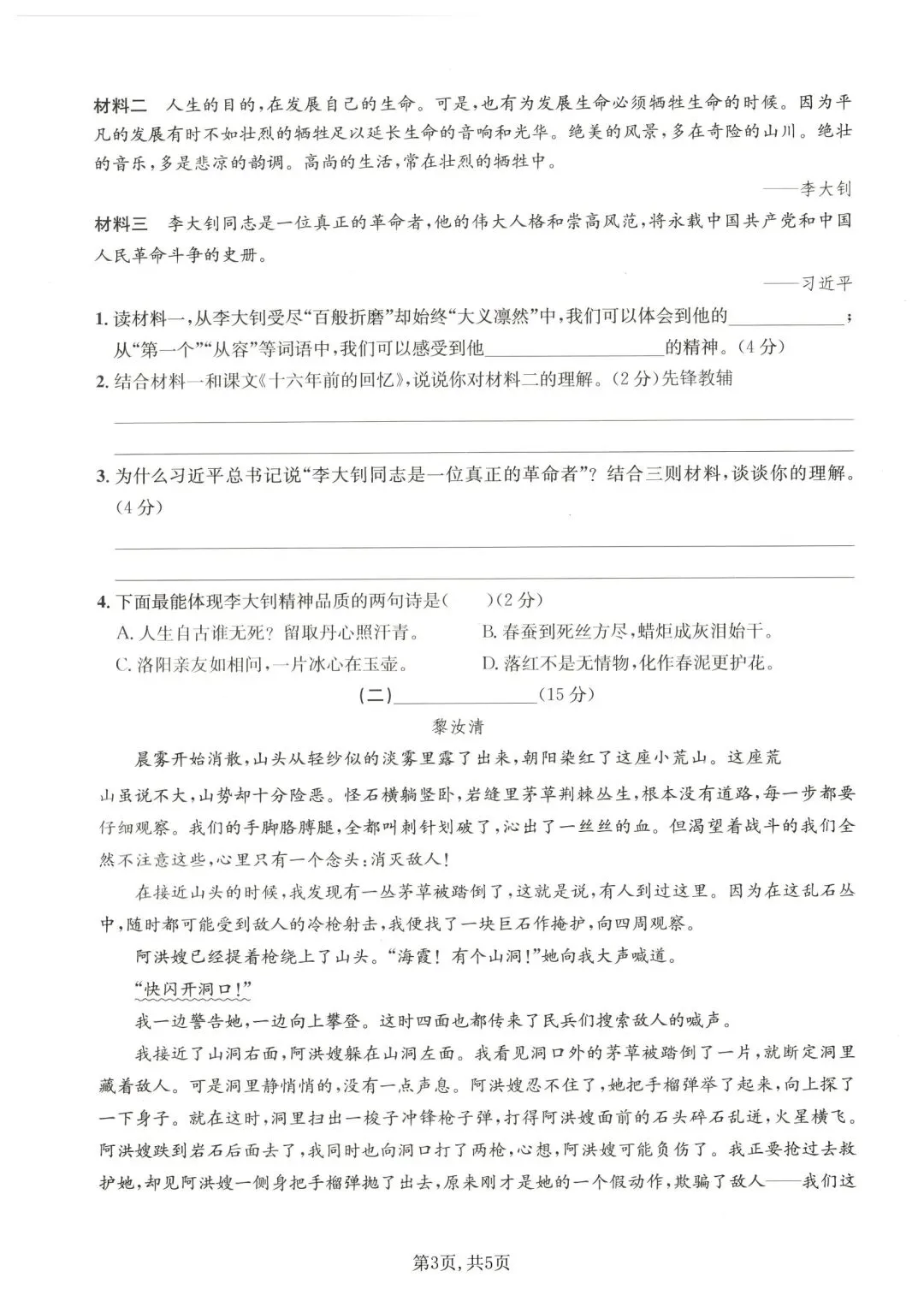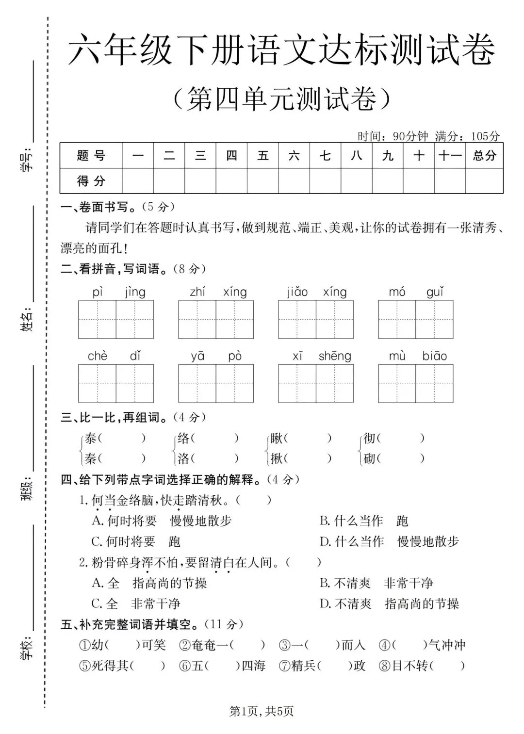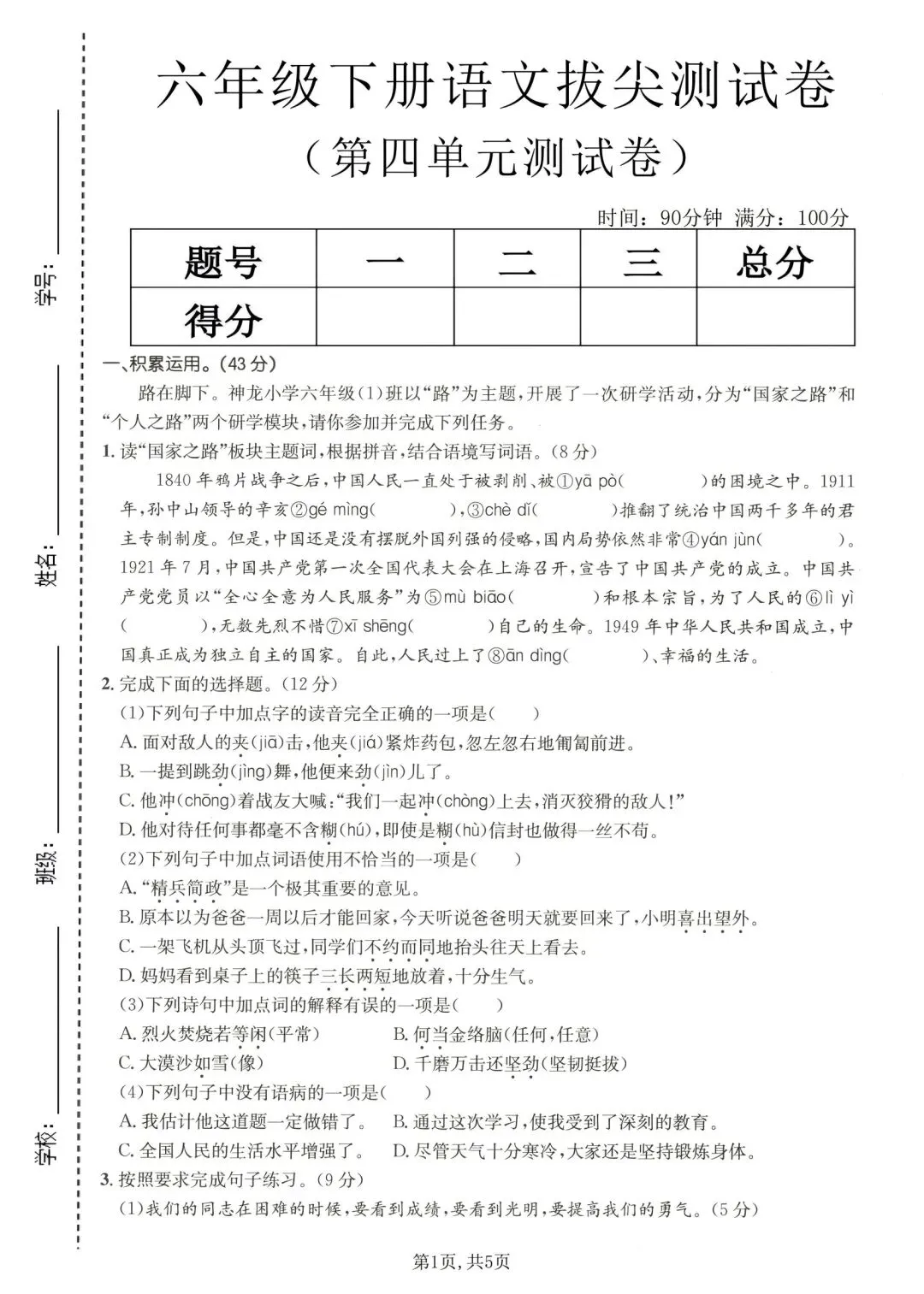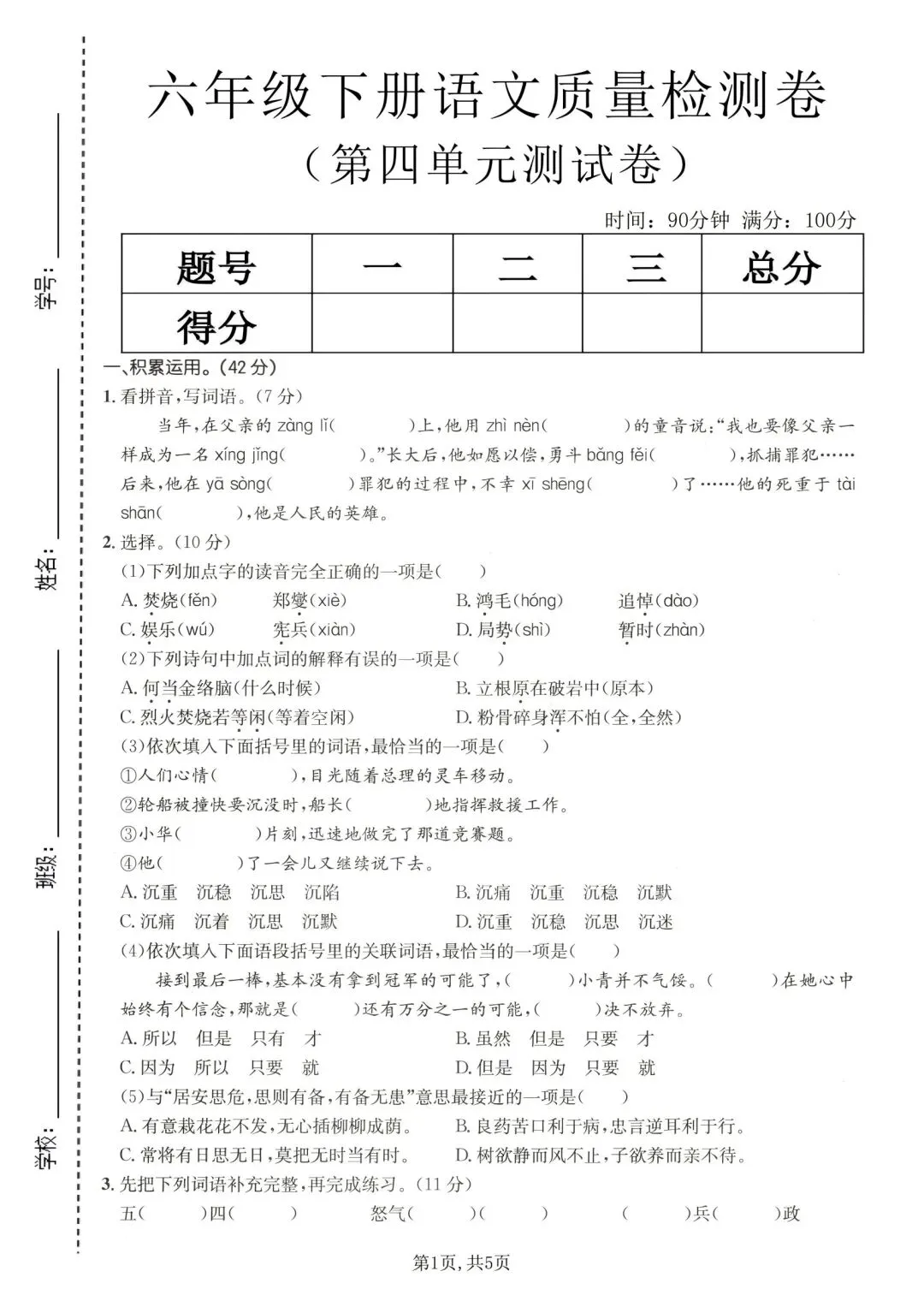 2026年春六年级下册语文人教部编版《第四单元·检测试卷》(共3套,含答案)| 完整可打印