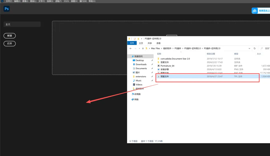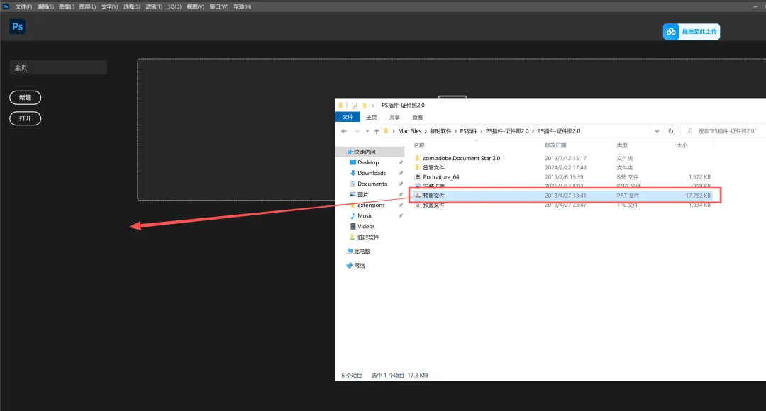 7.打开已安装的PS软件,将安装包中【预置文件.pat】拖入到软件窗口中。
