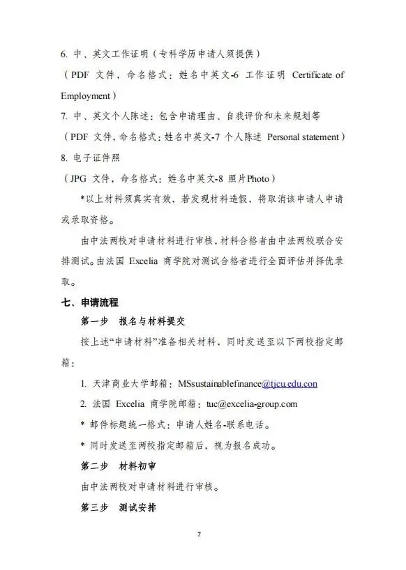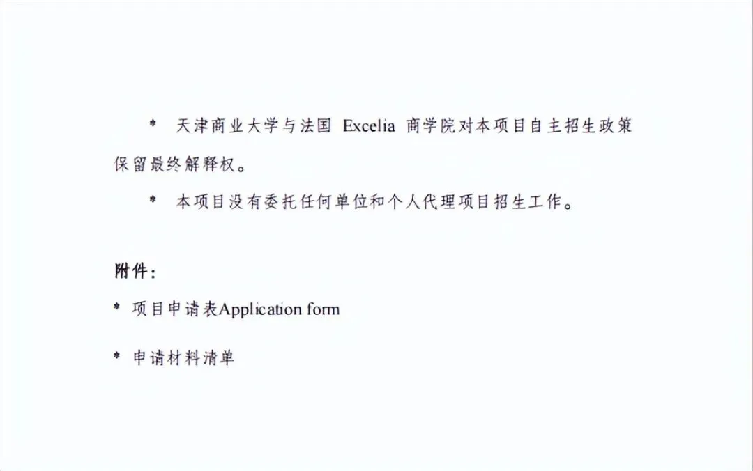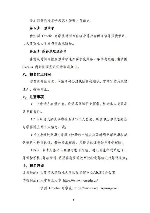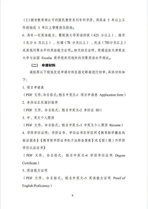 6.具有一定英语能力,需提供大学英语四级(425分以上)、雅思(总分6及以上)、托福(78分及以上)、托业(785分及以上)或其他同等水平的英语能力证明。如无相关证明,须通过由天津商业大学与法国Excelia商学院共同组织的同等英语水平测试。