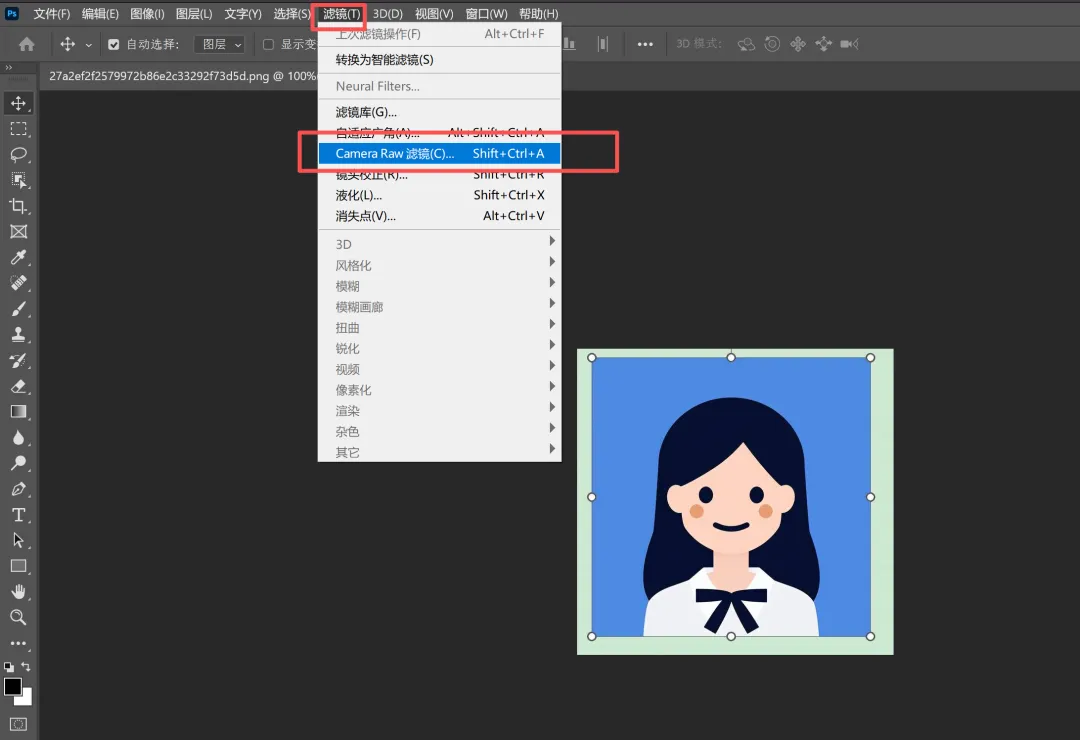 8.用PS任意打开一张图,然后点击【滤镜】选择【CameraRaw滤镜】。