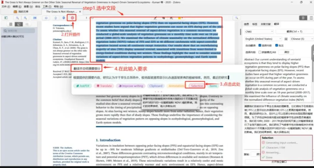 选中一段文字 → 右键 → Zotero-GPT → Ask PDF -