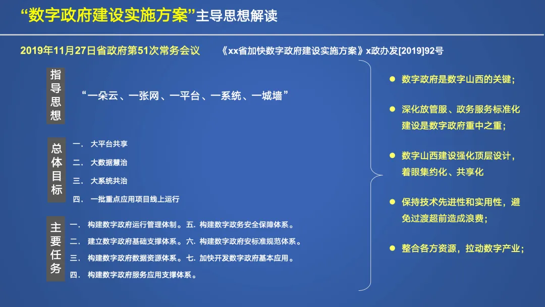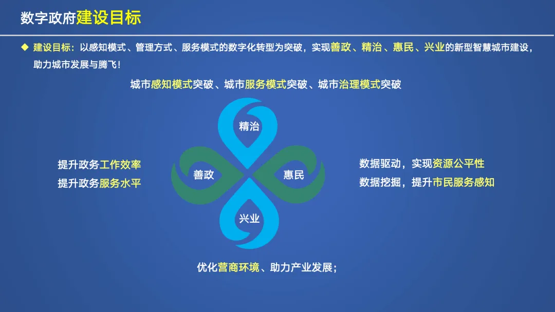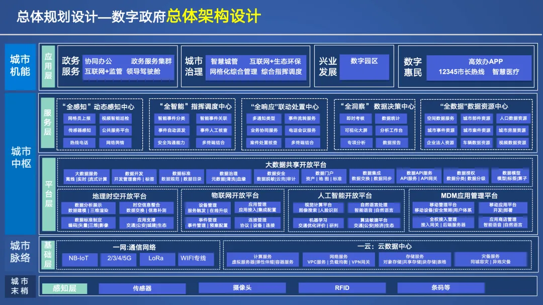 数字政府建设以”一朵云、一张网、一平台、一系统、一城墙”为技术架构,通过”全感知、全智能、全洞察、全响应”的能力体系,实现政务服务和城市治理的全面数字化升级。