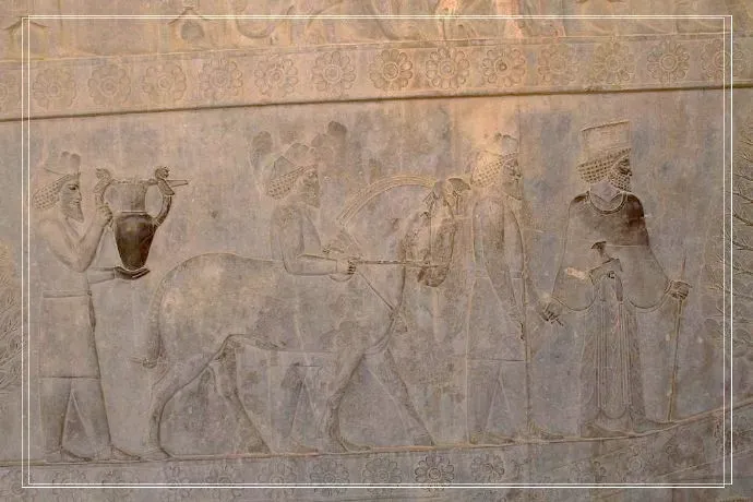 10.图1是波斯波利斯遗址中一幅著名浮雕的局部图,描绘了各国使节身着特色服饰,手持本地物产,依次列队向波斯国王进献贡品的场景。该图展现了波斯帝国