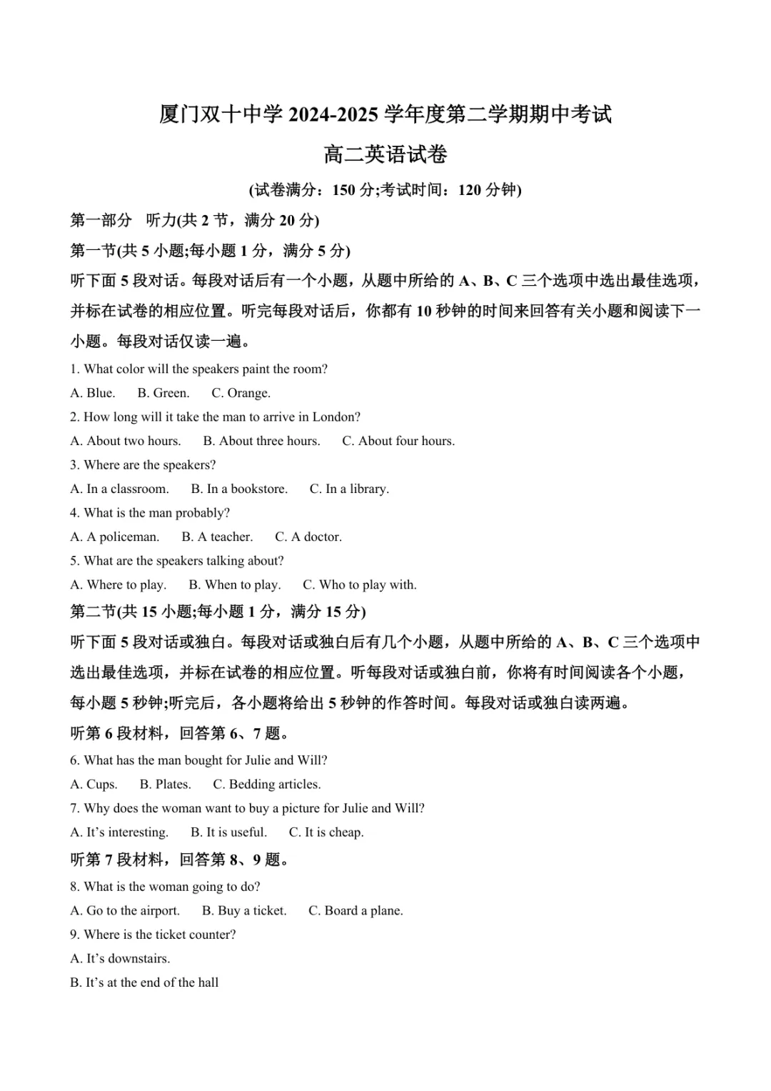 【可下载】福建省厦门双十中学2024-2025学年高二下学期4月期中考试 英语 Word版含答案