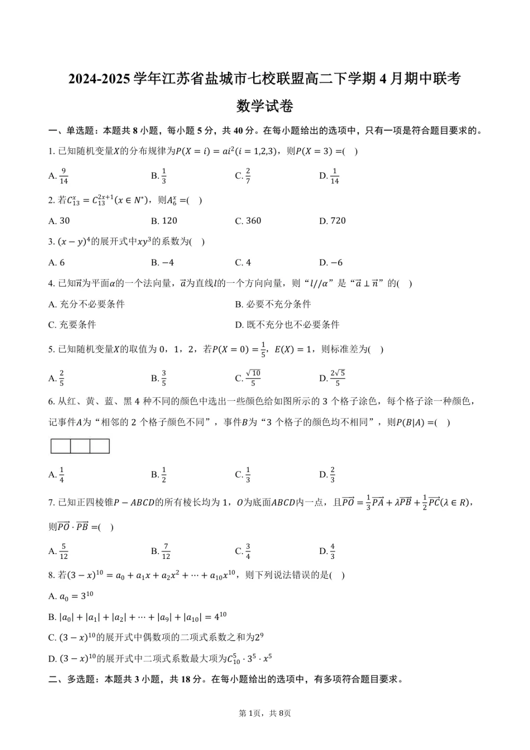 【可下载】江苏省盐城市七校联盟2024-2025学年高二下学期4月期中联考数学试卷(PDF版,含答案)