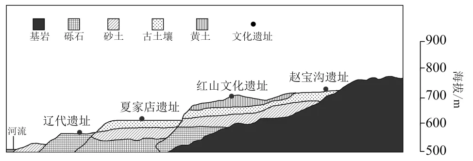 西拉木伦河为西辽河北源,干流发源于大兴安岭,后向西流经内蒙古半干旱气候区,水位季节变化大,但依然是沿岸地区的重要水源地。考古研究显示,西拉木伦河局部河段存在着受水资源供应影响具有文化联系的不同时期的文化遗址。下图为西拉木伦河局部河段河流阶地横剖面及人类文化遗址分布示意图。据此完成下面小题。