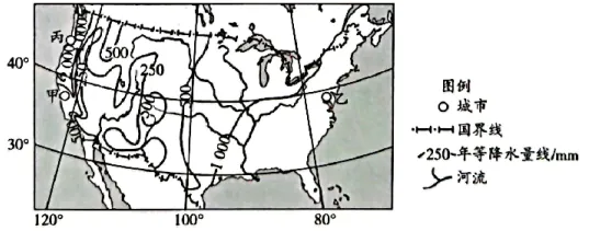 下图示意美国本土年降水量分布,甲地冬季气温较乙地高。据此完成下面小题。