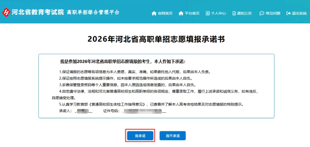 考生首次进行志愿填报须仔细阅读“2026年河北省高职单招志愿填报承诺书”,点击“我承诺”进入志愿填报入口页面。