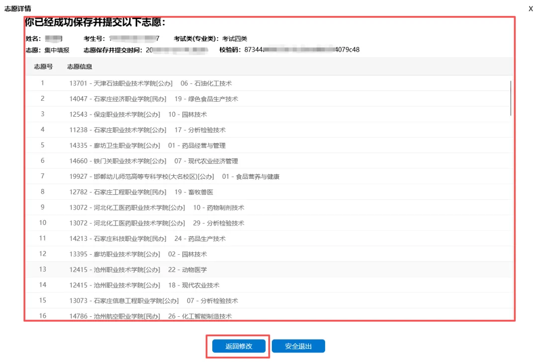 在志愿详情页面,考生可查看已保存并提交成功的志愿信息,考生须认真核查,如图12所示。如需修改可点击“返回修改”按钮,返回志愿填报页面进行志愿修改。志愿修改后,须重新进行志愿保存并提交。