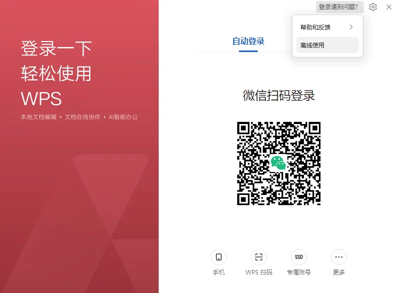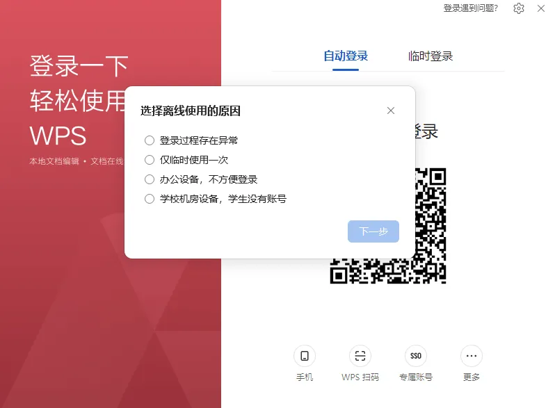 WPS 工具栏变灰、功能失效?不用登录也能救! 网修吧—专注分享电脑、打印机、网络等日常办公使用技巧与故障解决方案,一看就会,日常办公不求人 职场人员用的最多的就是wps吧,你有没有遇到过wps的工具栏是灰色的,功能全部用不了,需要登录账户,才能正常使用。 但是有想临时登录或者没有网络而无法登录。 今天分享一个离线解决方法,几步就能恢复正常使用: 点击登录页面右上角 点击登录遇到问题? 离线使用 选择离线使用原因 工具栏便可恢复正常。 日常办公不求人,简单实用的办公技巧,记得收藏备用