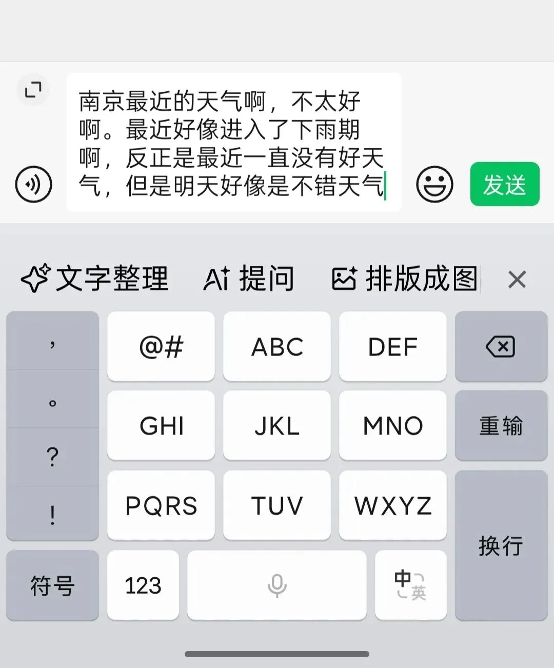 开发团队显然意识到,一次性语音转写难以完全避免语病或冗余。因此,微信输入法新增了智能「文字整理」功能:只要输入框中有文字,即可一键调用,自动优化语句通顺度,并清除“嗯”“啊”等语气词。