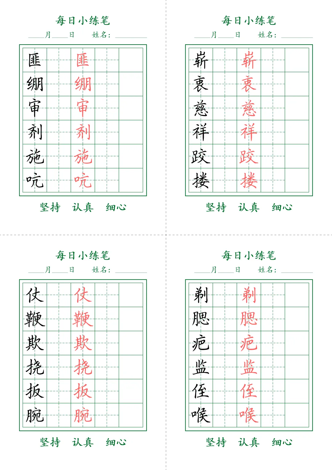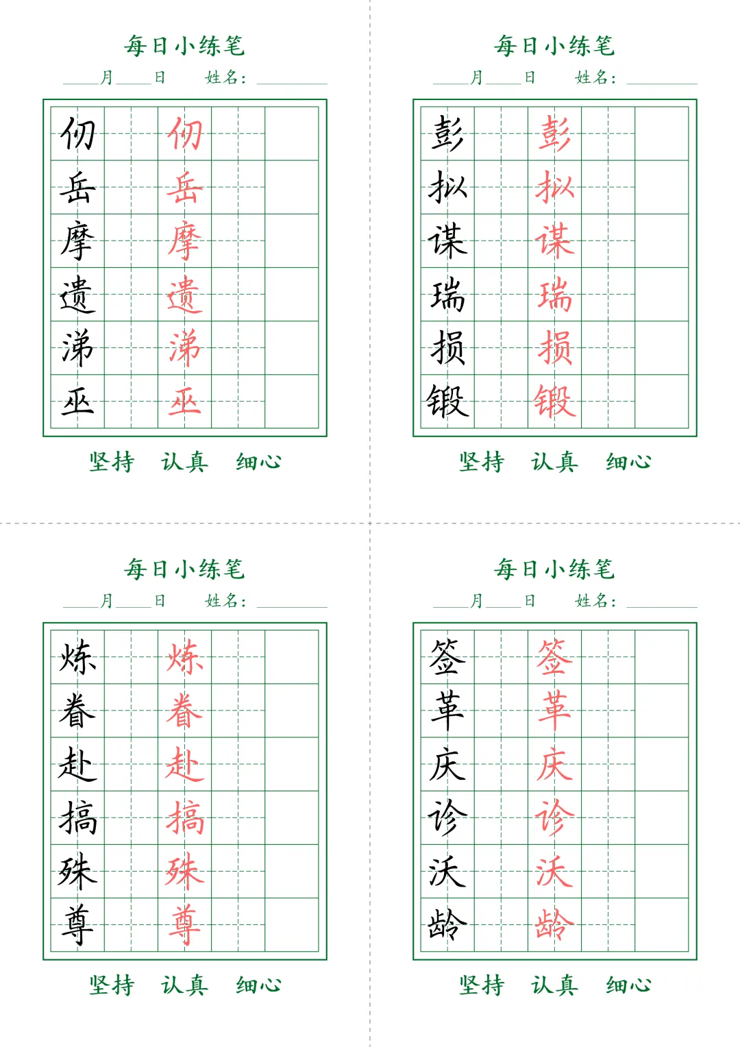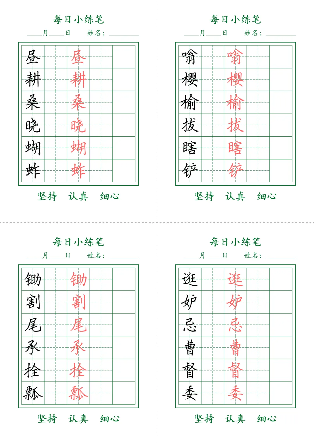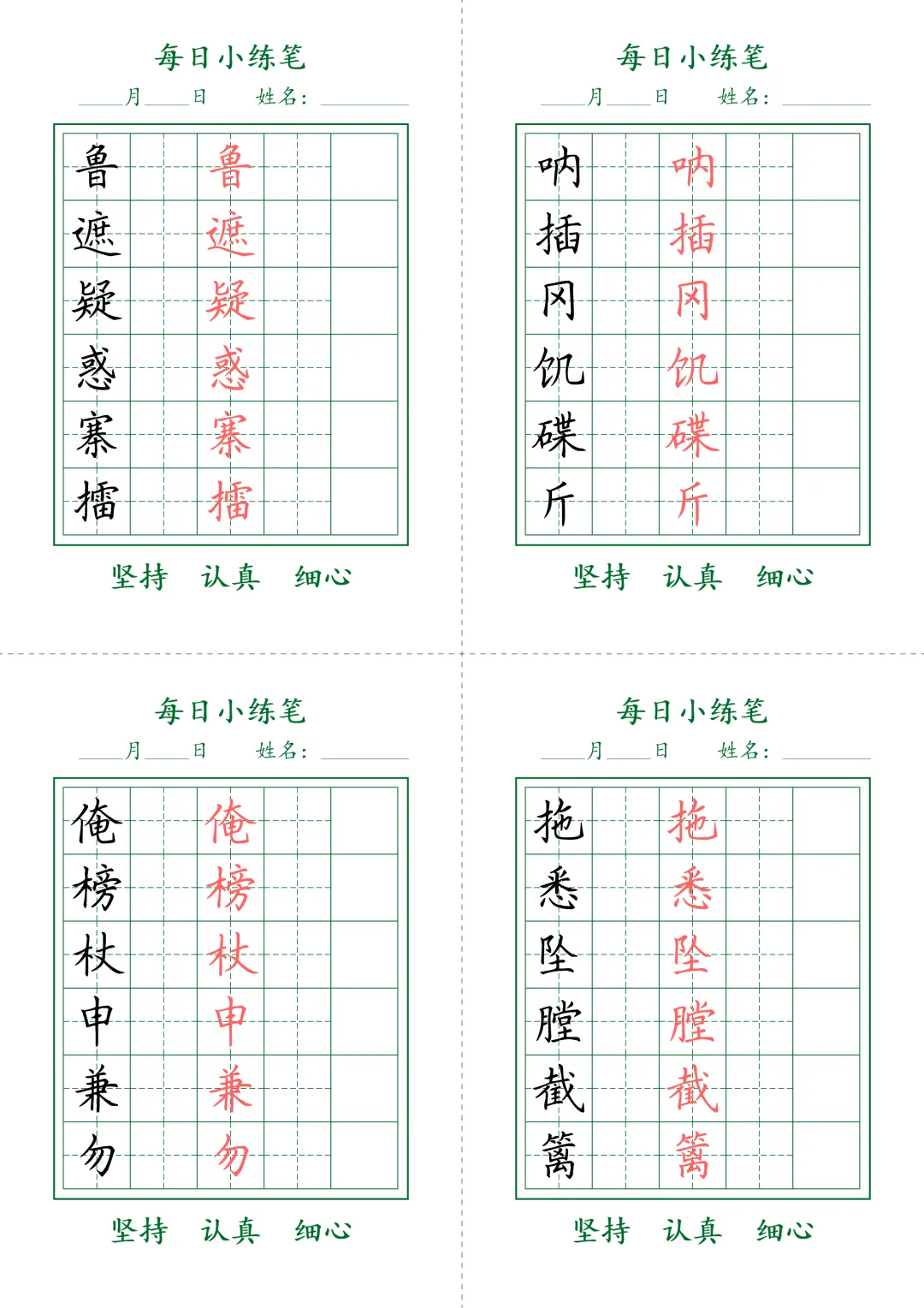 今天为大家分享:书写是语文学习的核心基本功,规范的字迹不仅是卷面加分的关键,更是文化素养的直观体现。每日小练笔田字格字帖,精选了中高年级必会生字,搭配标准红描红示范与规范田字格,每一页都标注了书写要求,排版清晰、针对性强,是日常练字、巩固生字、提升书写规范度的绝佳工具,养成良好书写习惯,夯实语文基础。