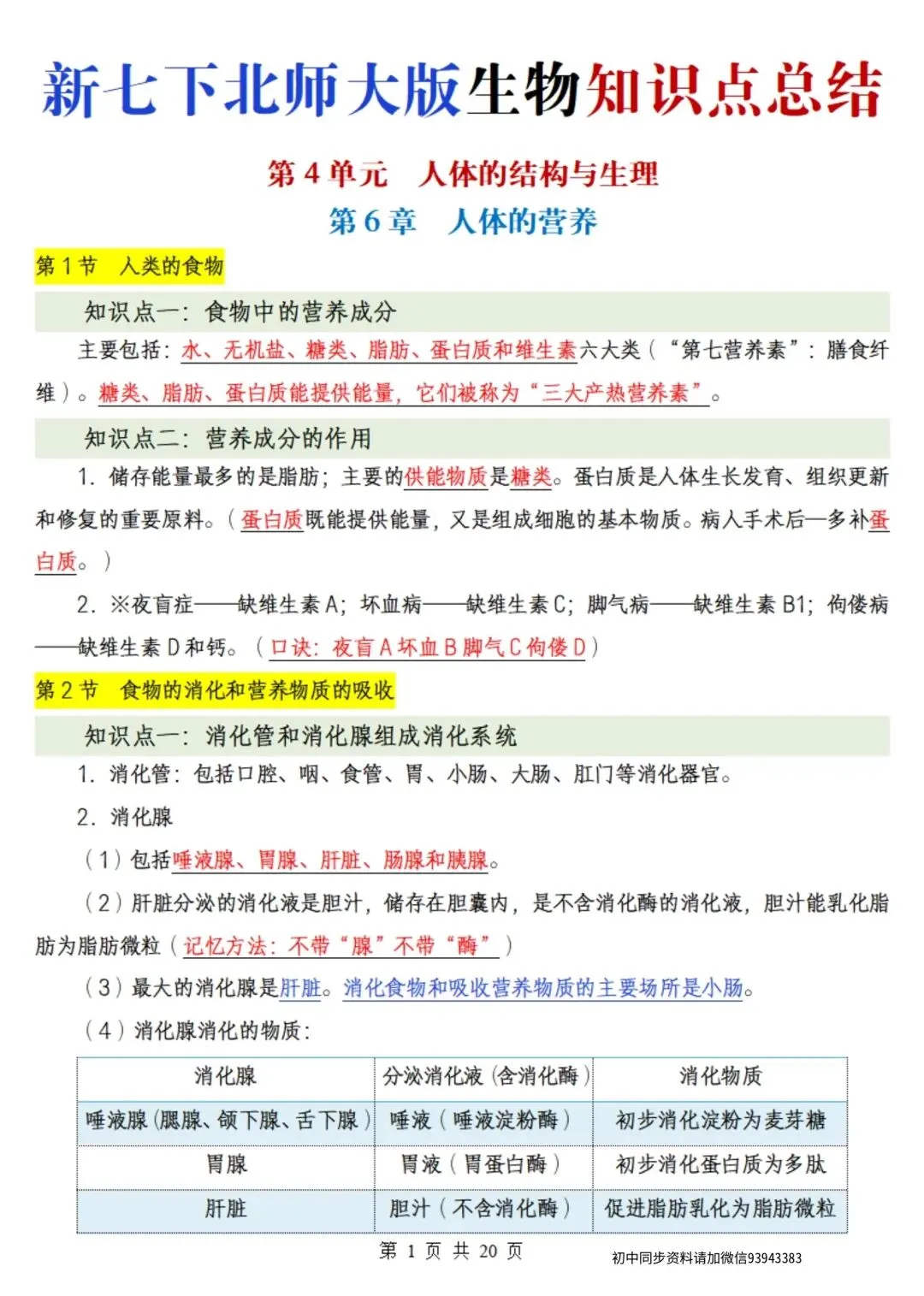 新七下生物(北师大)知识点总结(可下载打印) 资源下载见图片底部 资源介绍 电子版PDF文档 网盘下载链接详见页面底部 ▼内容预览▼ 版面所限,此处仅展示部分内容 完整版电子版👇 获取完整电子版方式 👇 点击下方卡片关注 进入“瑶瑶妈妈爱学习”的后台 发送消息 资料下载 获取打印电子版方式 重要说明 版权声明: 本公众号分享的资源,所有文件版权归原作者所有,如有侵权可以联系本人删除。本公众号尊重版权,有任何版权问题,可以直接在公众号留言,我看到后会回复。