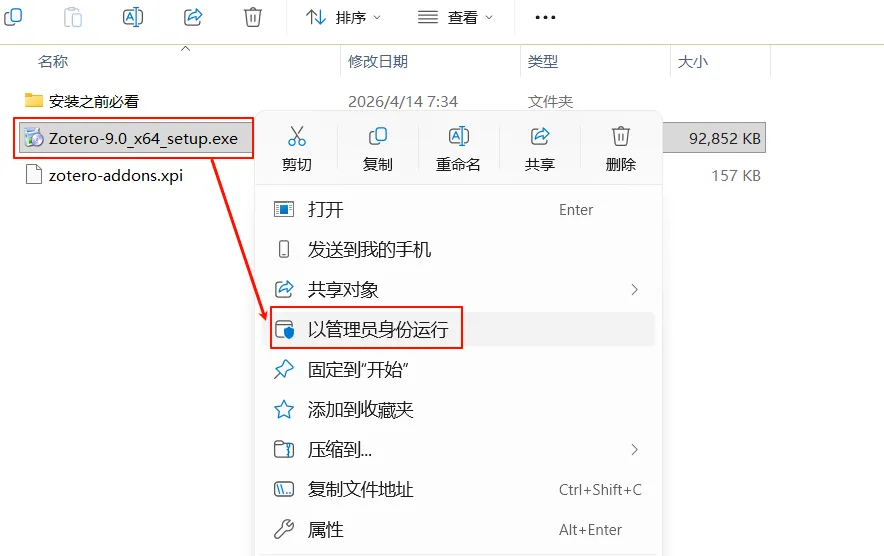 2.选中“Zotero-9.0x64_setup.exe”鼠标右键选择以管理员身份运行