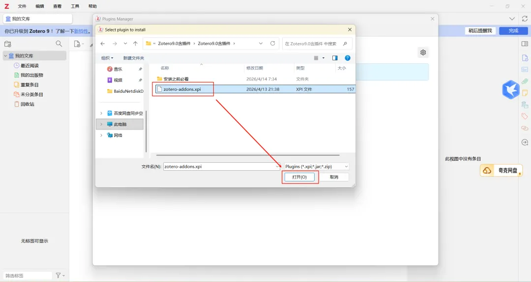 12.选中“zotero-addons.xpi”,点击“打开”