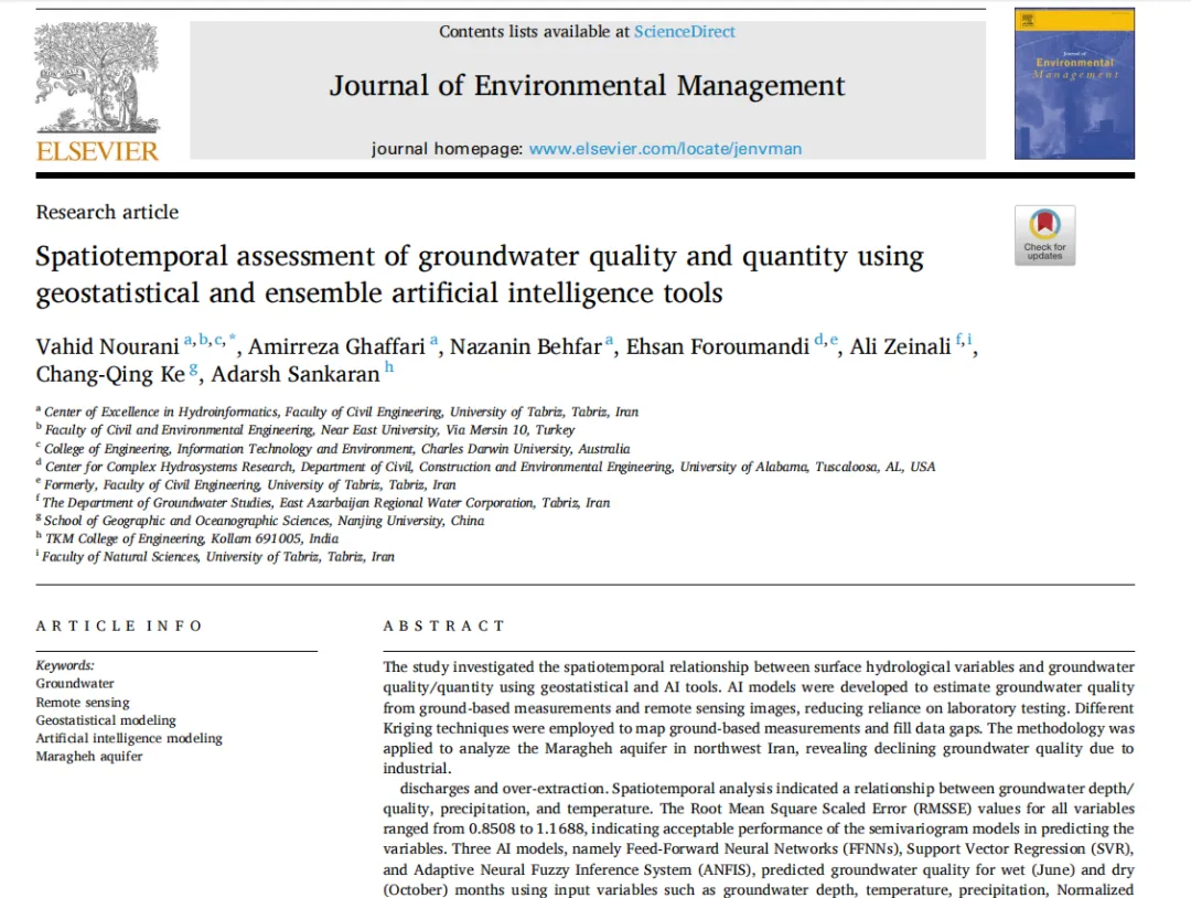 [文献精读]1区 利用地质统计和集成人工智能工具对地下水水质与水量进行时空评估
