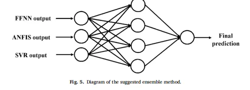 这篇文章的方法分三步走。第一步是地质统计插值:用普通克里金对地下水深度、水质指数(GWQI)、降水和温度等地面观测数据进行空间插值,填补数据空白并生成连续的空间分布图,同时用RMSSE评价半变异函数模型的预测性能。第二步是时空分析:结合GRACE卫星的陆地水储量异常(TWSA)数据分析地下水储量的长期变化趋势,再结合Landsat 8的NDVI和SRTM的DEM等遥感数据进行地下水深度和水质的时空格局分析。第三步是AI建模与集成:分别用前馈神经网络(FFNN)、自适应神经模糊推理系统(ANFIS)和支持向量回归(SVR)三个模型,以地下水深度、温度、降水、NDVI和DEM为输入变量,GWQI为目标变量,预测湿季(6月)和干季(10月)的地下水水质。最后训练一个额外的FFNN作为集成单元,非线性组合三个单模型的输出,提升预测精度。评估指标包括R²、RMSE、MAE和NSE。
