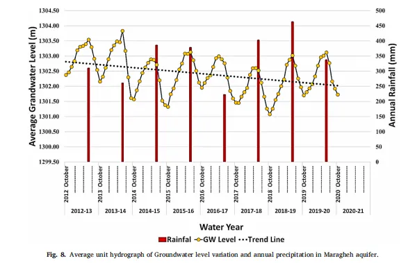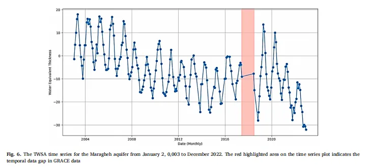 GRACE TWSA时间序列分析(如Figure 6所示)揭示了研究区水储量的长期变化趋势。2003至2022年间,马拉盖含水层的TWSA呈现下降趋势,表明地下水资源面临日益增大的压力。TWSA数据显示明显的季节性波动,与降水模式密切相关。