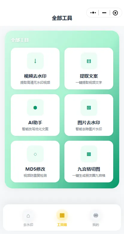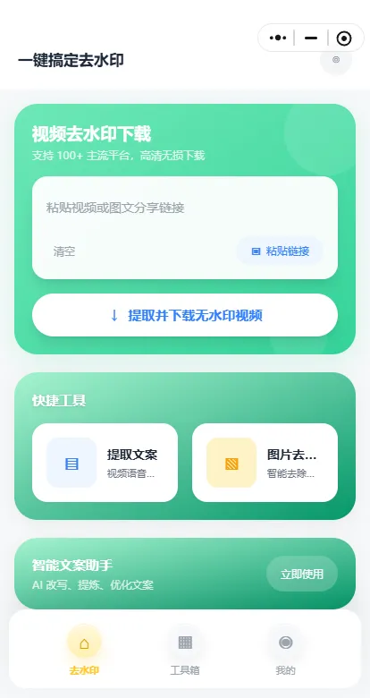 不用下载内存杀手 App,不用花几十块钱充什么 VIP,打开微信搜一个叫 【一键搞定去水印】 的小程序,就能把自媒体运营的“脏活累活”全部包揽!