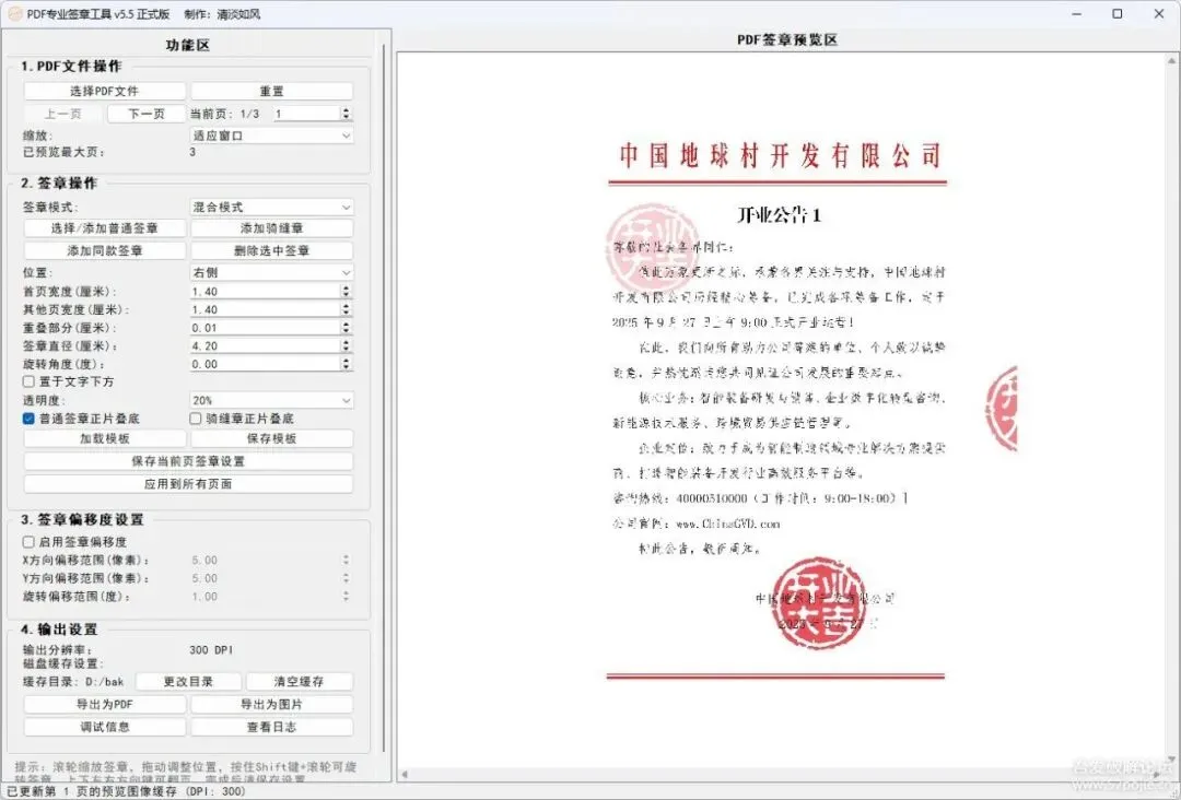 这个工具特别适合需要在合同、文档上批量添加电子签章的场景,尤其是处理多页PDF文件的普通或骑缝章签章需求。