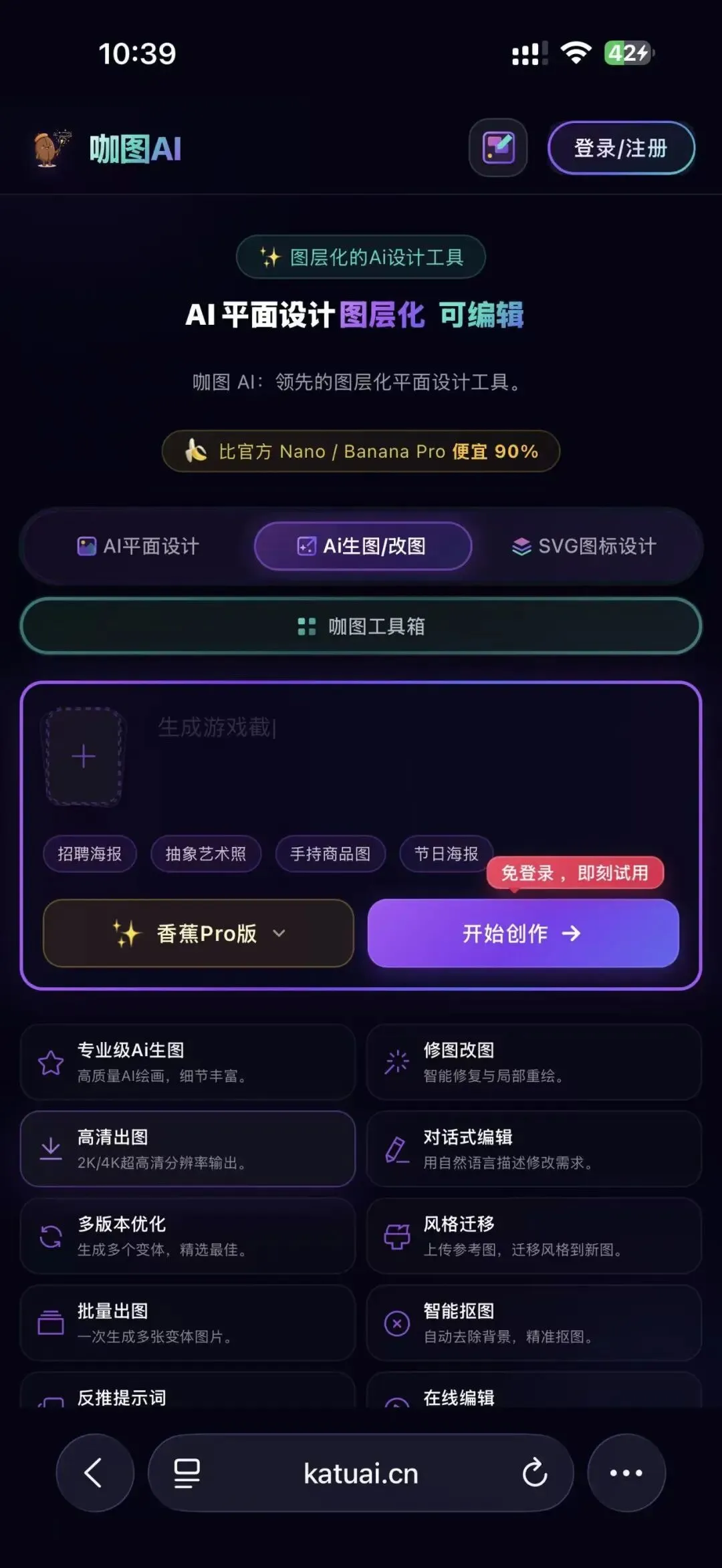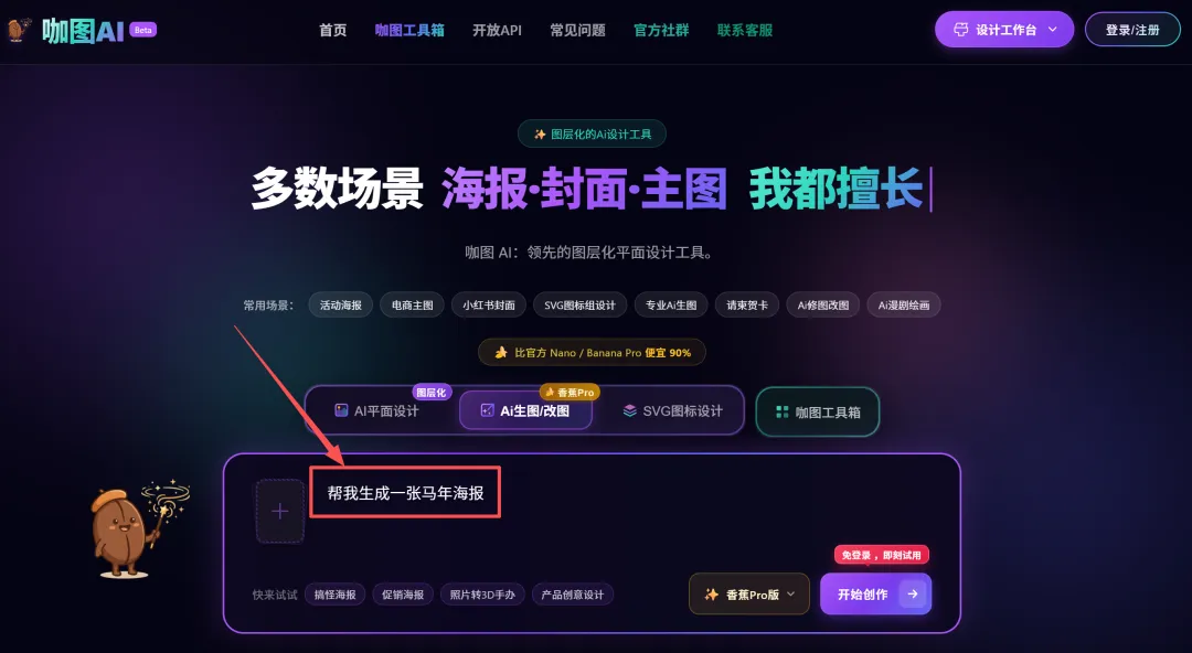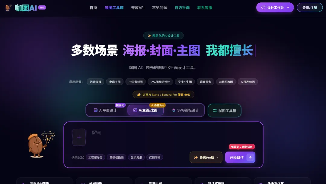 咖图 AI是一个主打高效率的 AI 图像设计平台,提供三大核心工作台:AI平面设计、Ai生图/改图、SVG图标设计,和丰富的场景化小工具,适合没有设计基础但经常需要用图的人使用。