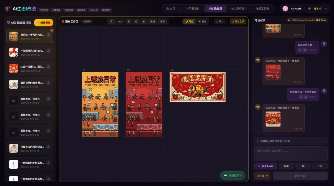 通过输入文字描述或上传图片,AI 就能快速完成生图、改图、抠图、背景替换、风格转换等操作,把原本复杂的设计流程简化成几步操作。