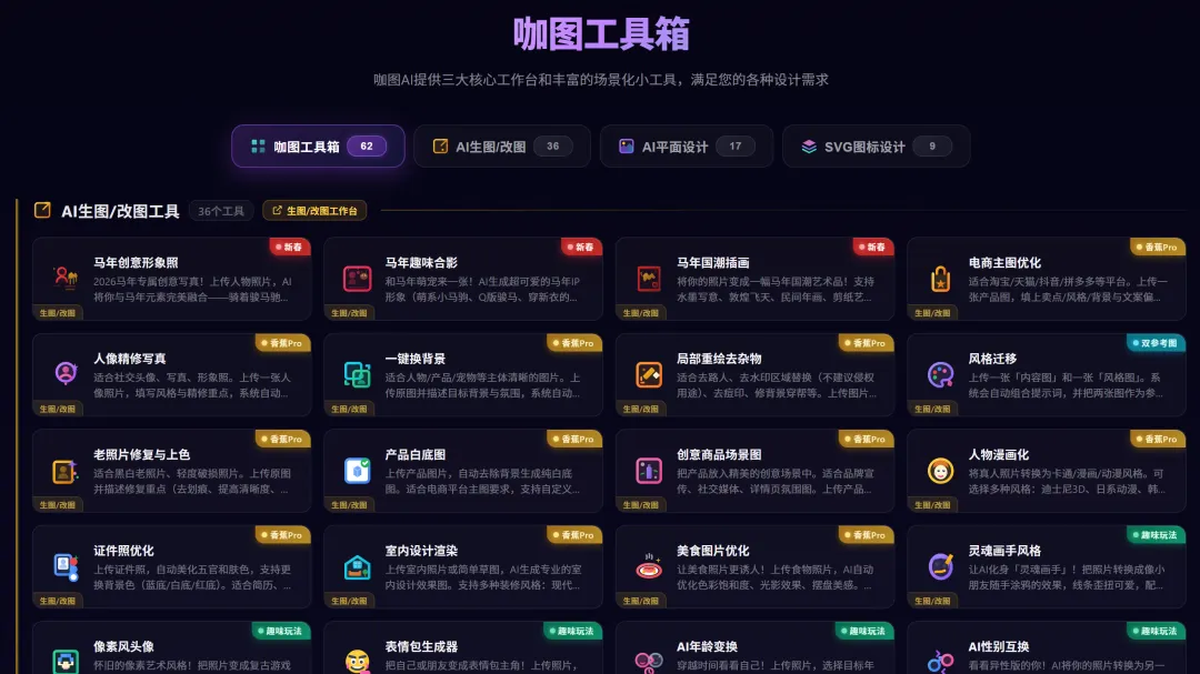 除此之外,咖图还提供了「咖图工具箱」,内置 62 种实用工具,覆盖图片处理、设计辅助和日常创作等多种场景,一个平台就能解决大多数用图需求。
