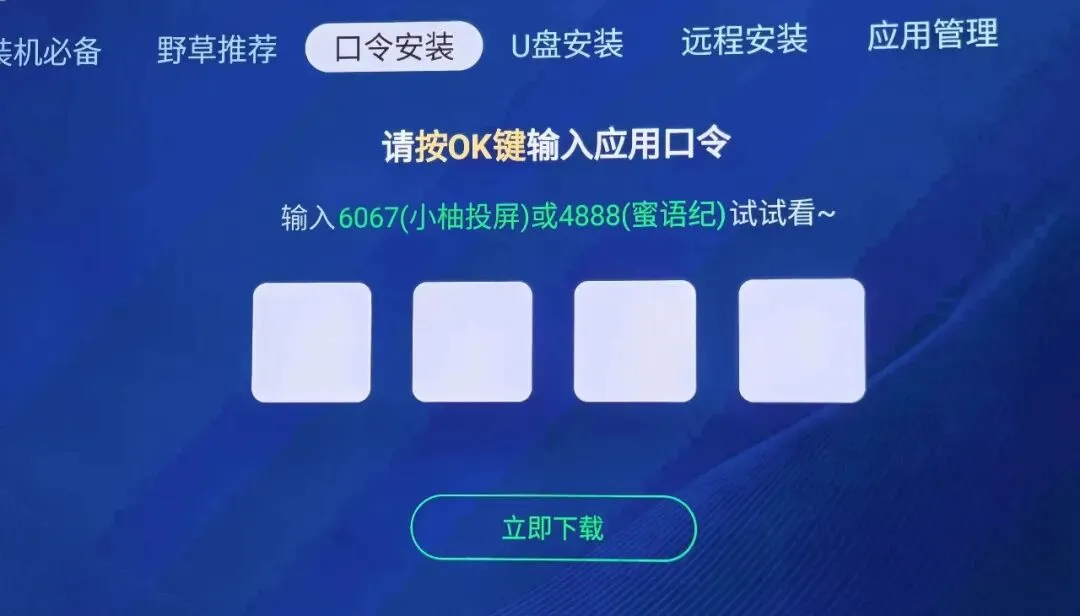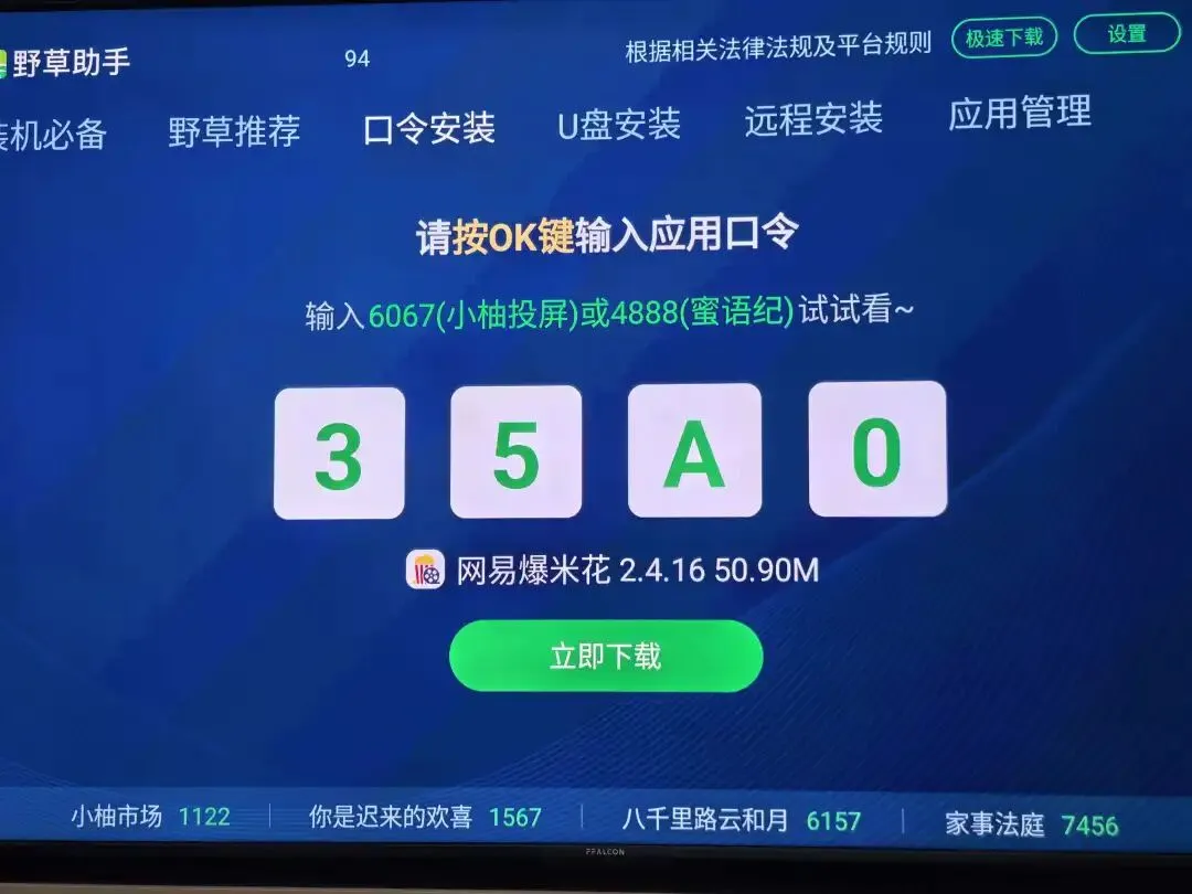 此时可以通过口令安装软件了,比如网易爆米花的口令就是35A0,输入口令后,点击下载安装,依次类推,其他软件同样也可以安装,只要找到对应口令。