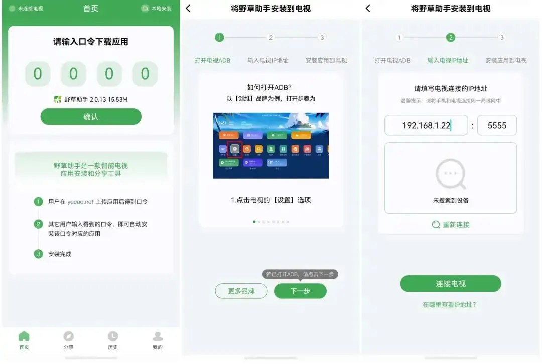 通过手机远程推送野草助手到电视,首先手机上先安装野草助手,安装好后,打开野草助手App,输入0000口令也就是TV版本的野草助手口令,点击确认,然后点击下一步,在第三个页面输入电视的IP,这里的IP可在电视的网络设置中查看到,点击连接电视,电视上会出现一个弹窗,点击允许连接即可,这个时候会自动把TV版本的野草助手安装到电视了。