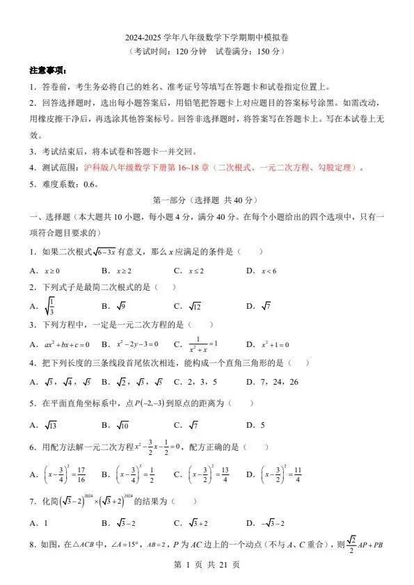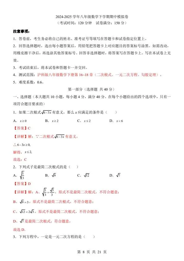 今日分享2026新八年级下册数学沪科版期中模拟卷(含答案+答题卡)完整电子版可打印!所有资料均为高清电子版,排版规整适配打印,不用费心整理,直接打印就能用。精准击破学习难点,帮孩子夯实基础、吃透考点,稳步提升学习效率!