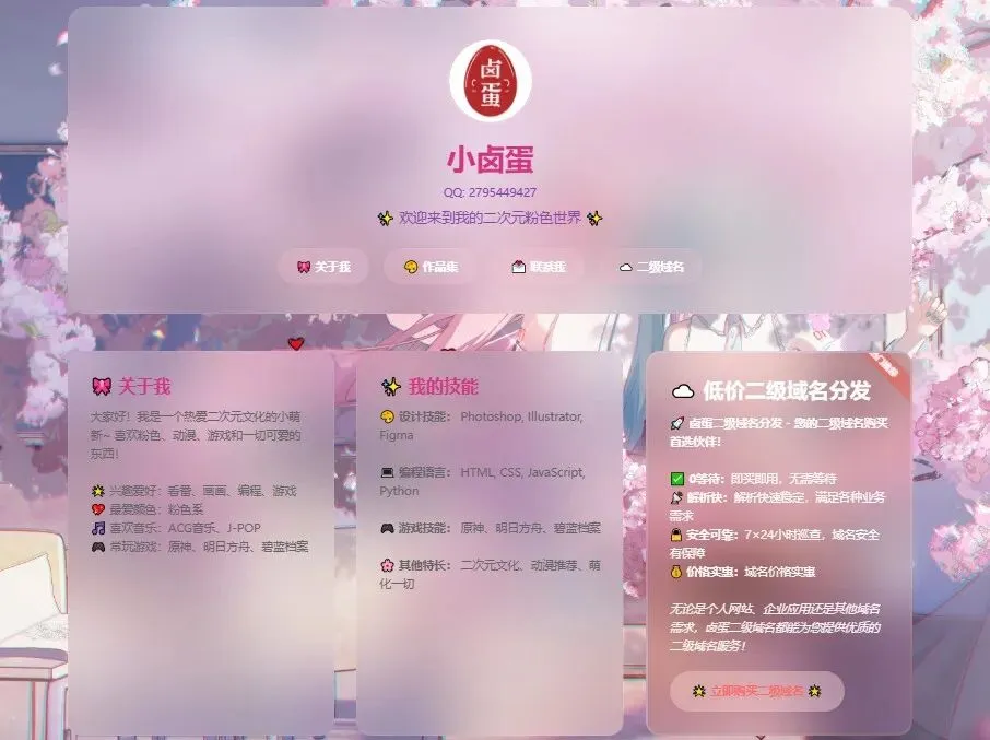 一个精美的粉色二次元风格个人主页,采用现代化的玻璃拟态设计和丰富的动画效果。