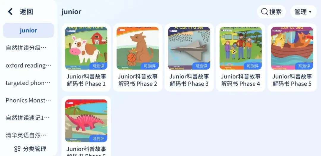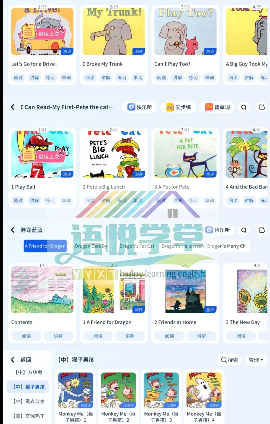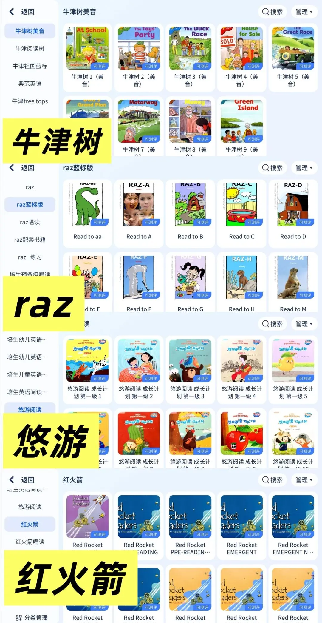 涵盖各种分级阅读比如RAZ,牛津树,海尼曼,红火箭,培生,悠游,大猫等等。