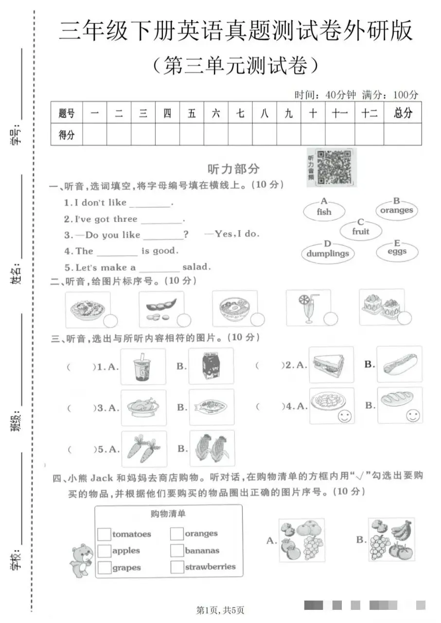 四、小熊 Jack 和妈妈去商店购物。听对话,在购物清单的方框内用“√”勾选出要购买的物品,并根据他们要购买的物品圈出正确的图片序号。