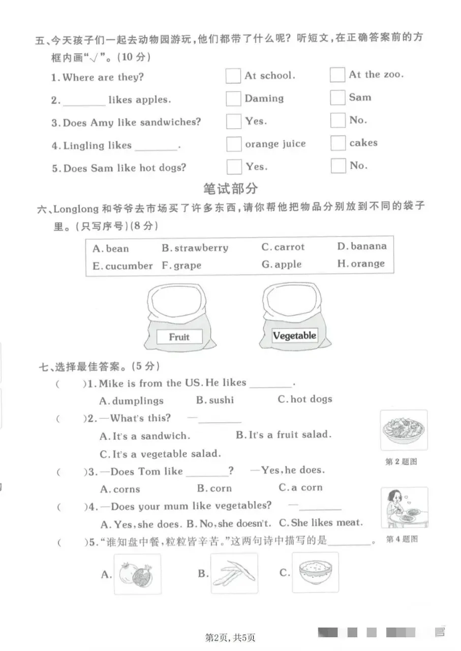 五、今天孩子们一起去动物园游玩,他们都带了什么呢?听短文,在正确答案前的方框内画“√”。